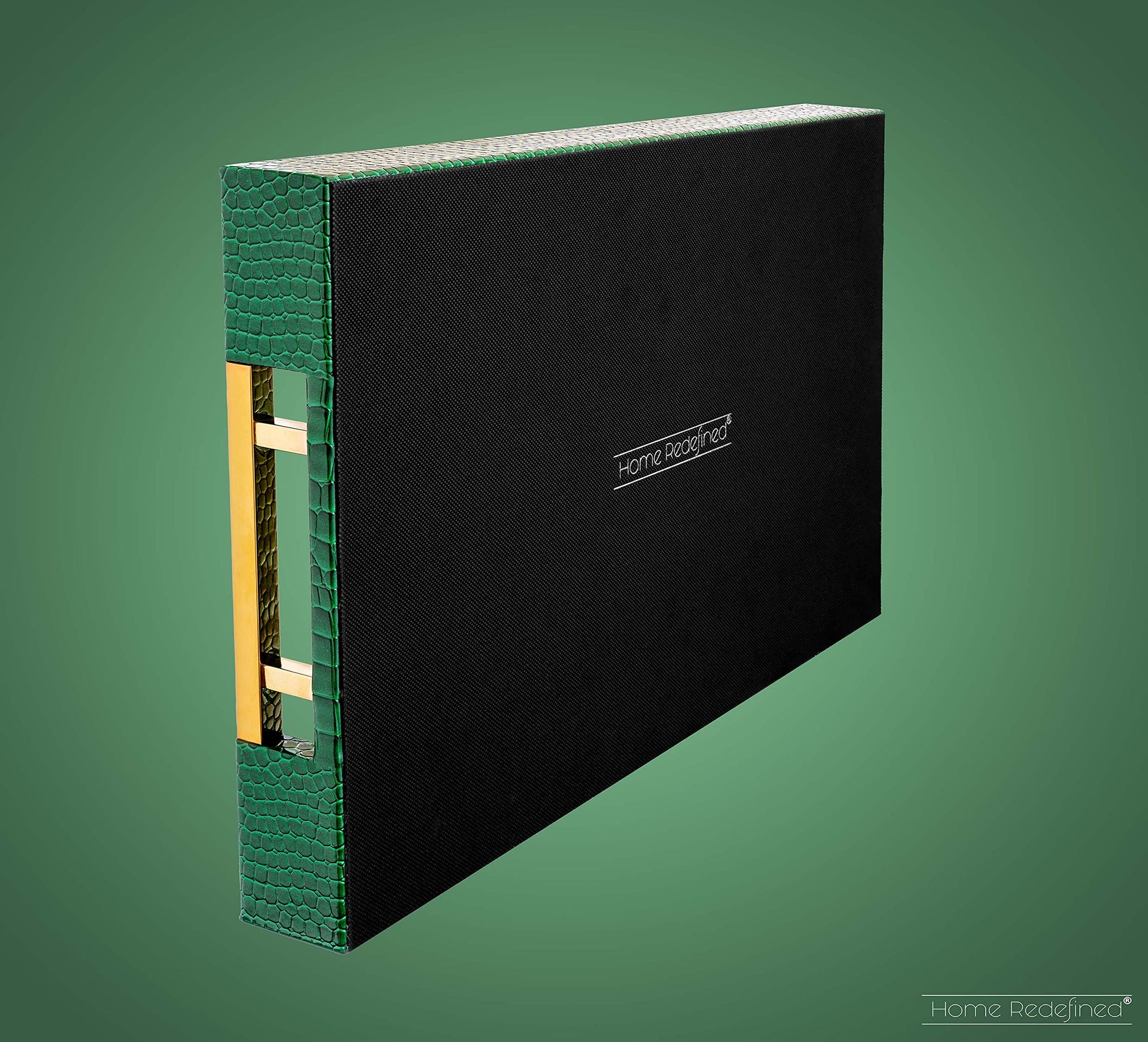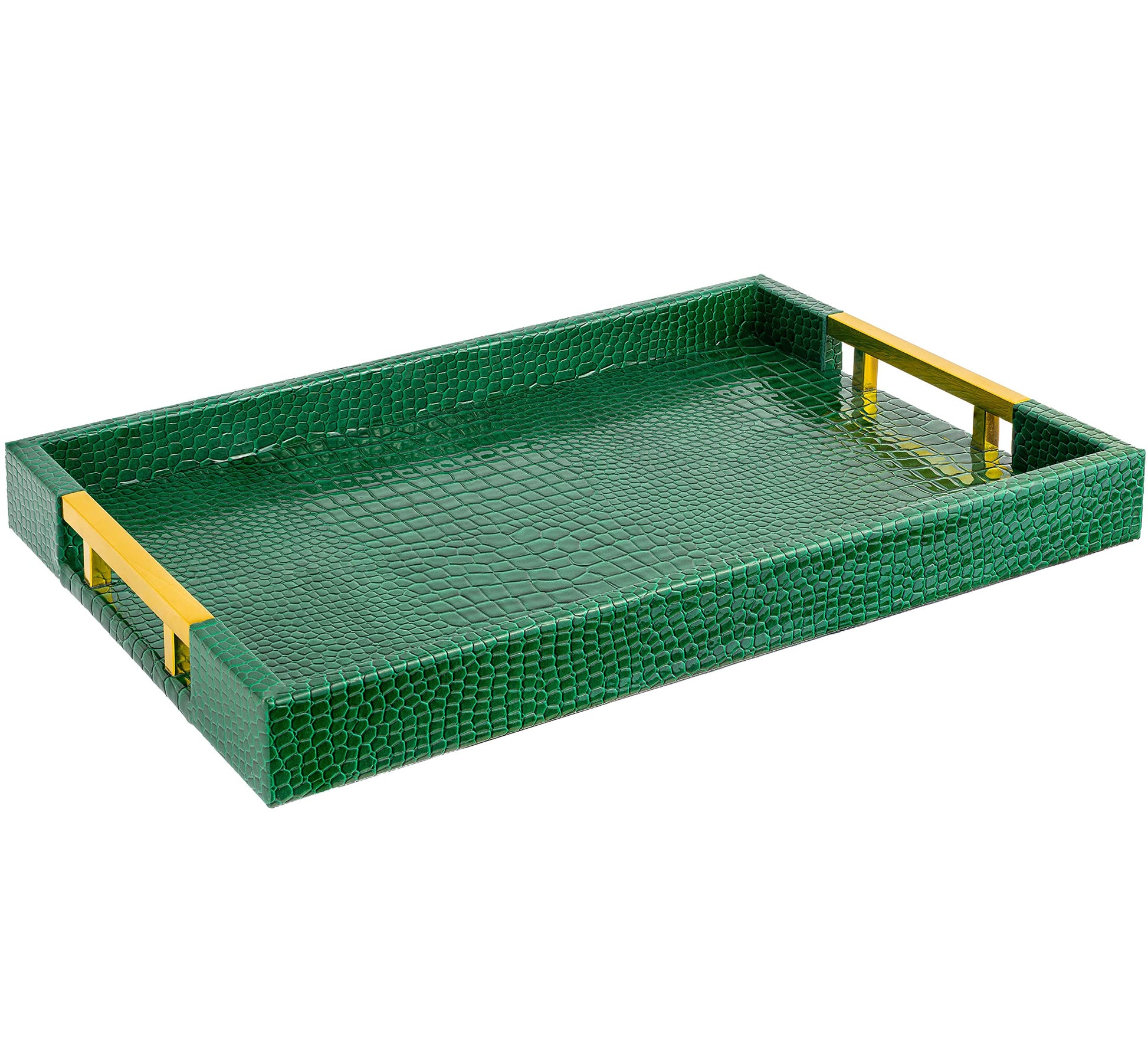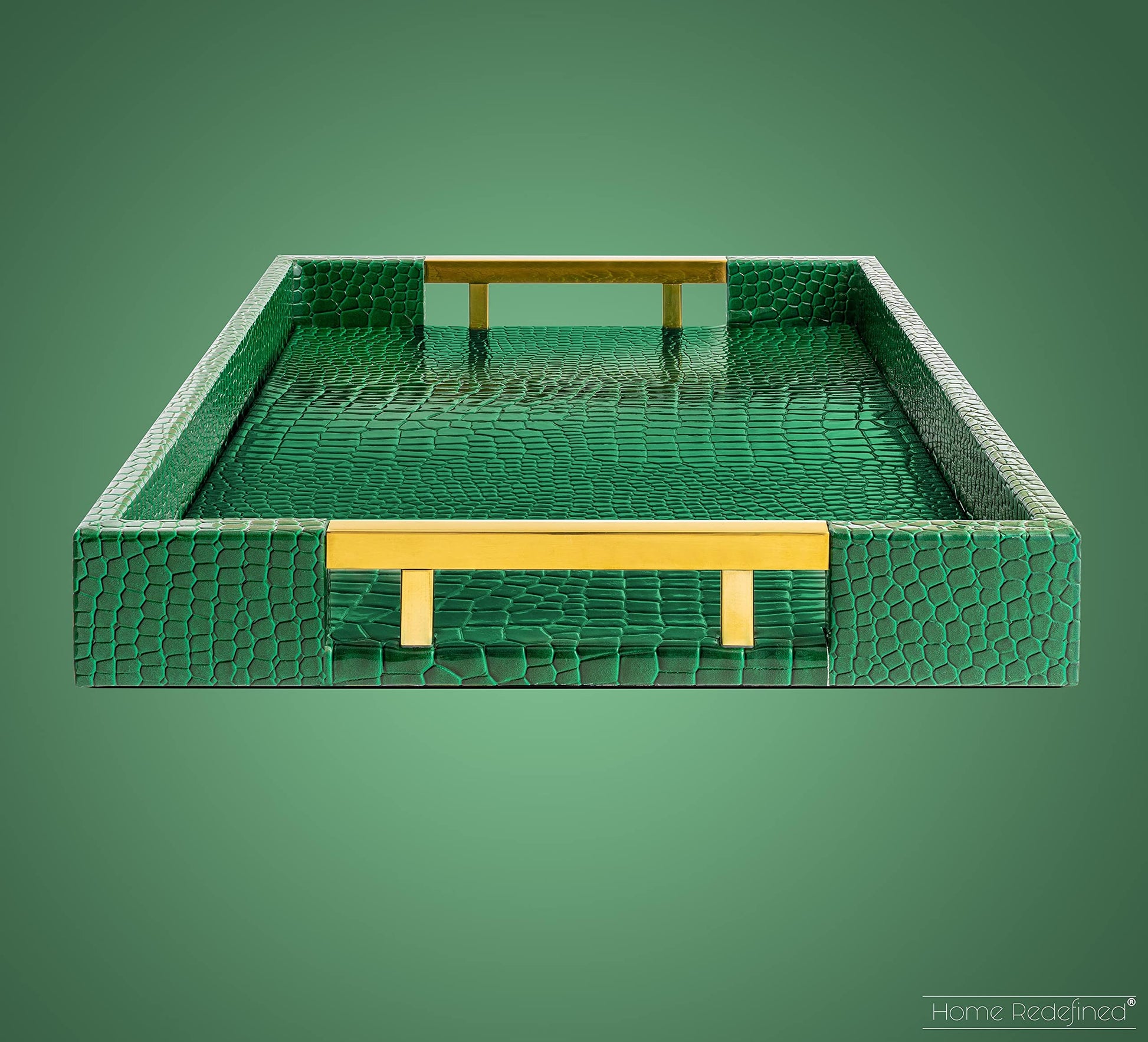 - DECORATE & ORGANIZE YOUR HOME: Eye catching modern crocodile green faux leather decorative serving tray with 201 polished gold stainless steel metal handles, the perfect addition to your home or office space.