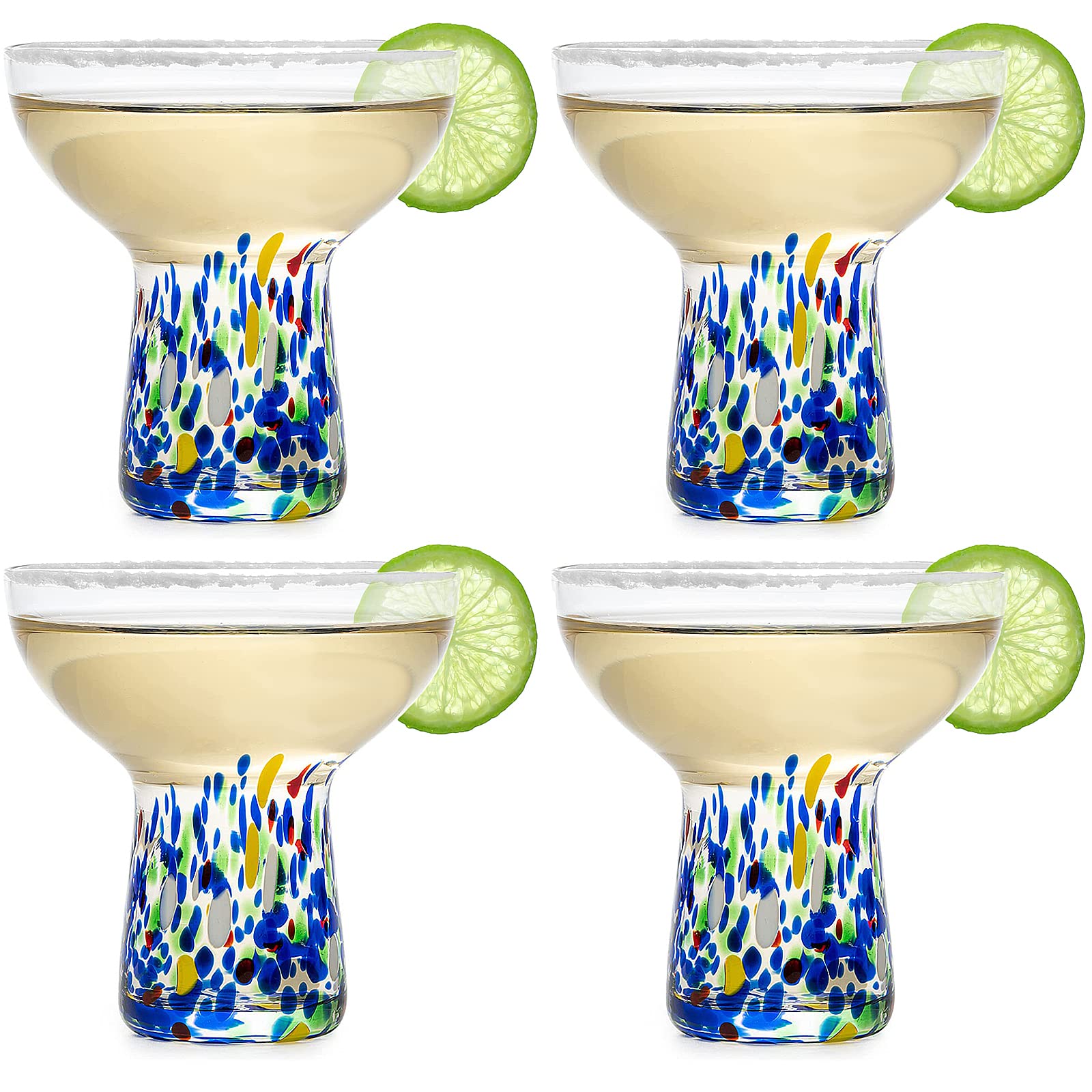 - COLORFULL HAND BLOWN: These hand-blown, colorful glasses feature a timeless confetti design. Handcrafted by skilled artisans, these margarita glasses will be a true conversation starter.