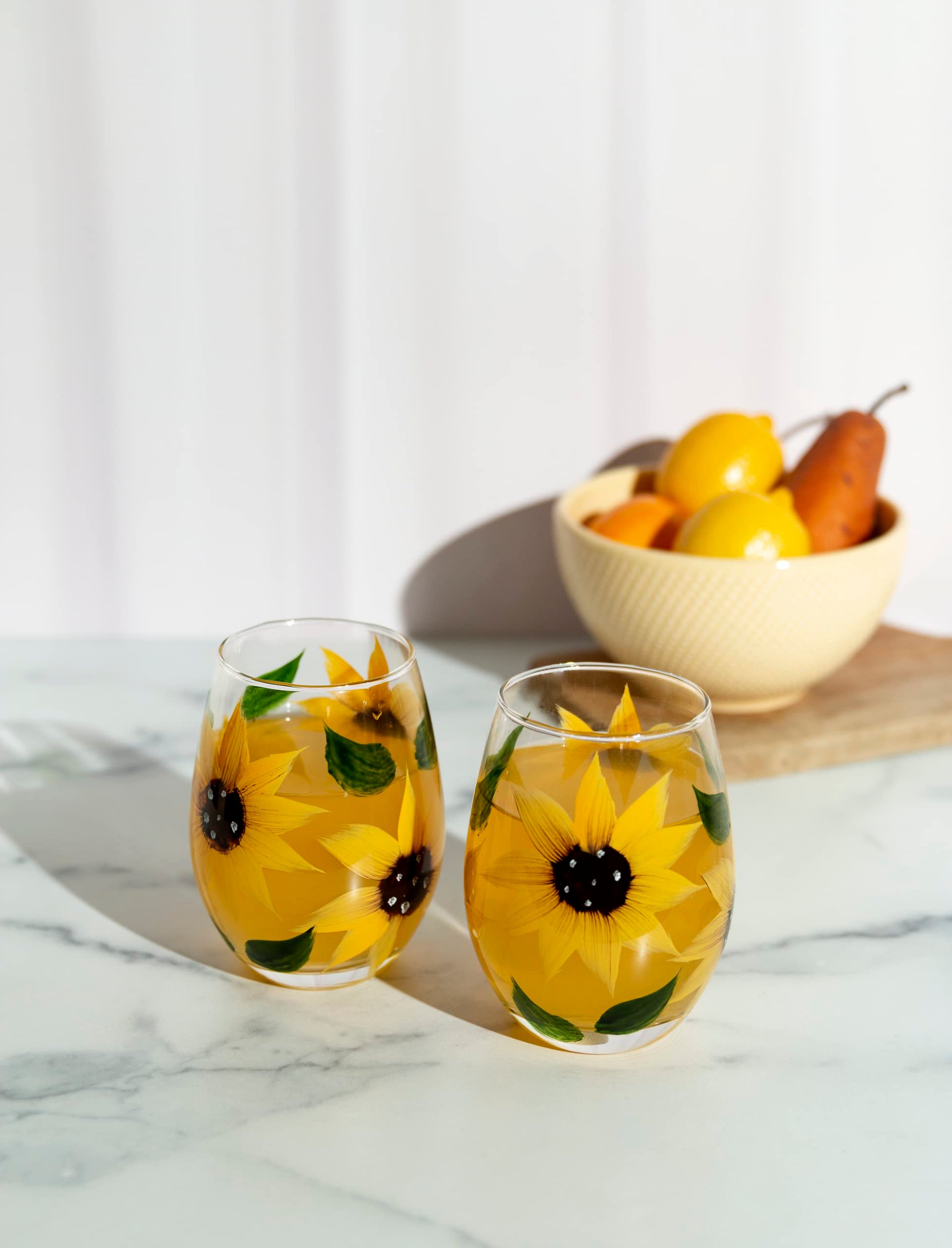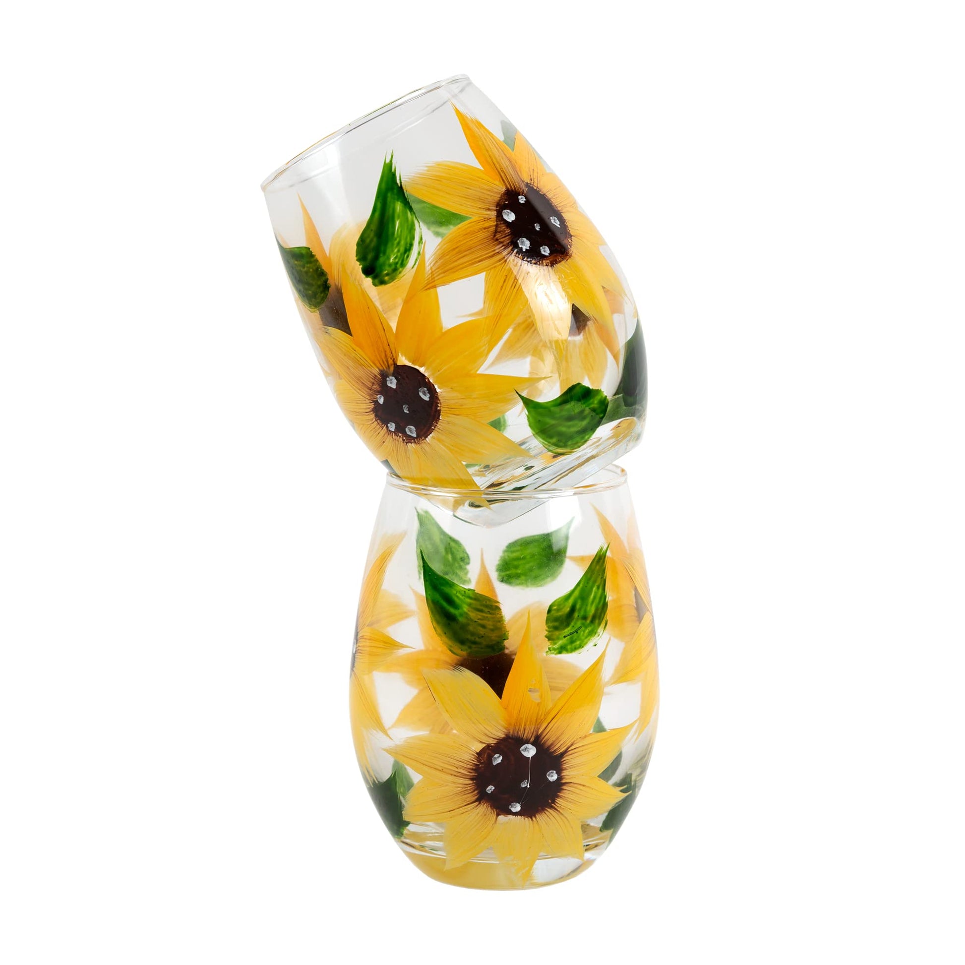 - Set of 2 stemless wine glasses with hand-painted sunflower designs