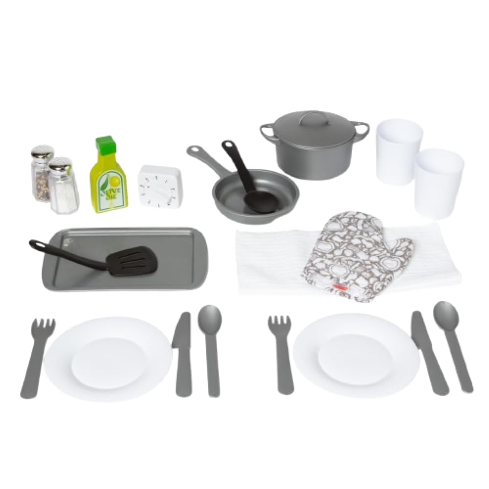 - Cook up pretend play fun with this 22-piece set of play kitchen accessories to help satisfy hungry imaginations