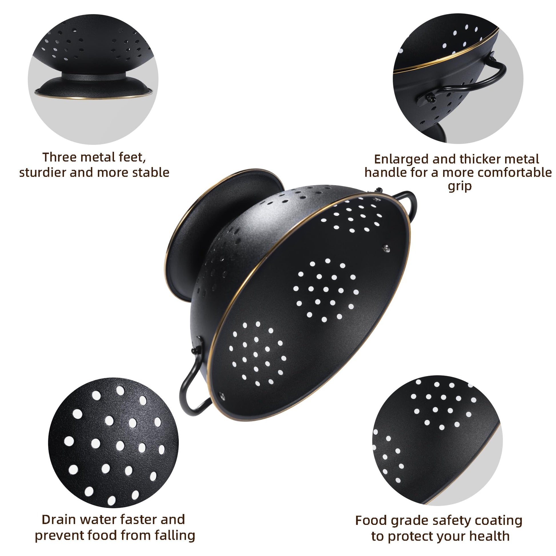 Metal Colander Set of 2, Strainer Basket with Handles perfect for Spaghetti, Pasta, Berry, Vegetable, Fruit, Solid Base Powder Coated Self-draining Kitchen Colander Bowel, 3.5 & 5 Qt, Matte Black