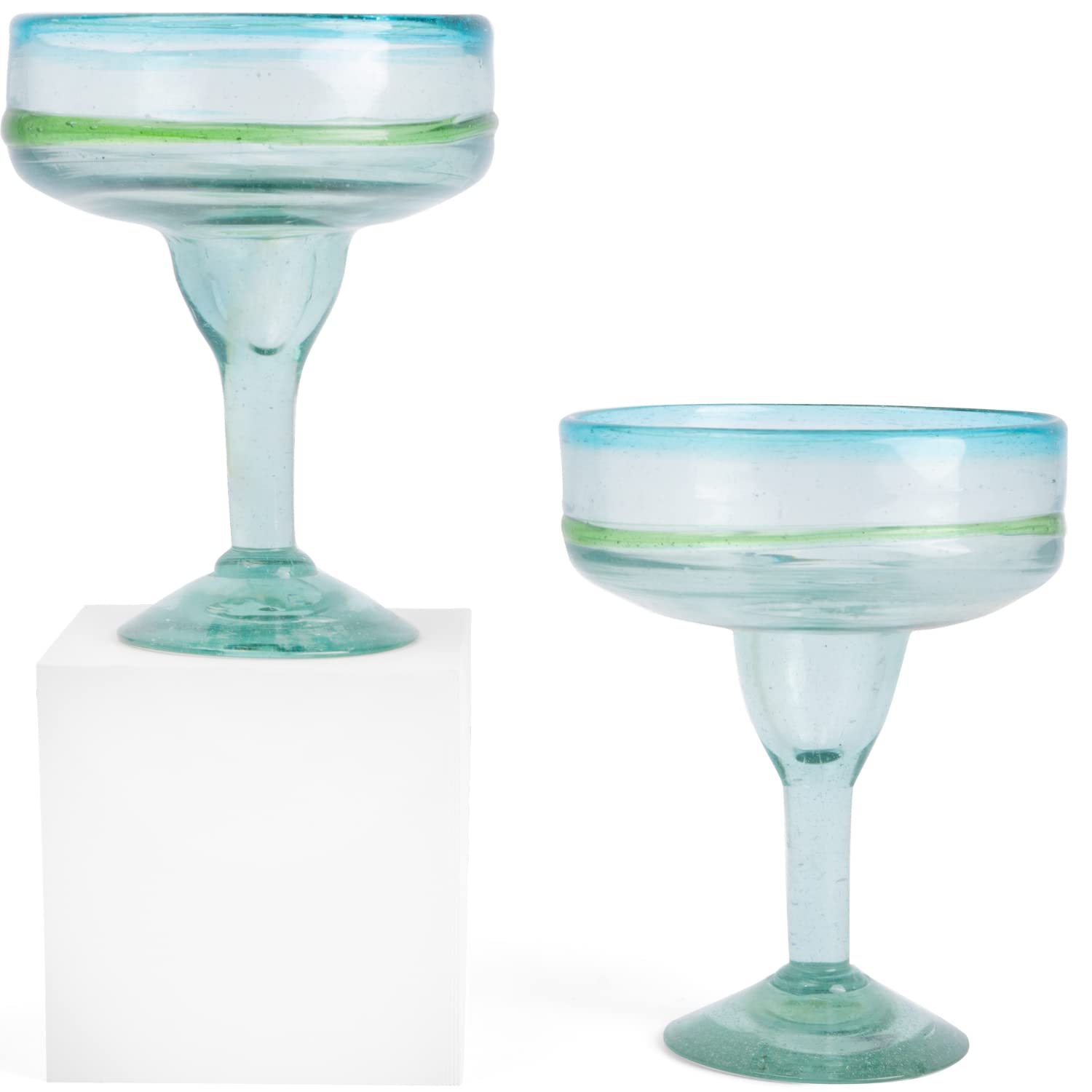 Mexican Glassware, Aqua Rims 16oz Margarita Glasses, Set of 2 Unique Hand Blown Glass, Handcrafted by Talented Artisans Thick & Sturdy Easy to hold