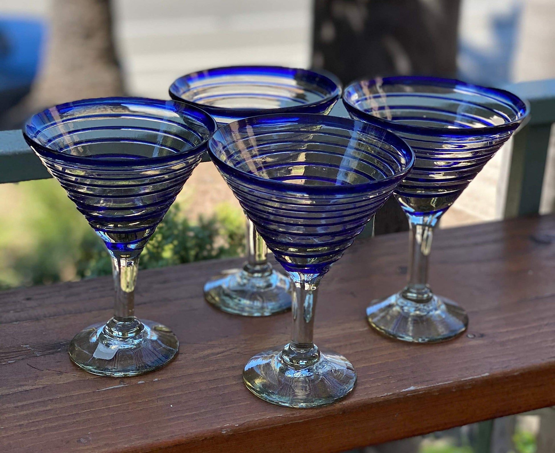 Mexican Hand Blown Glass – Set of 4 Hand Blown Modern Margarita Glasses - Blue Spiral (12 oz)