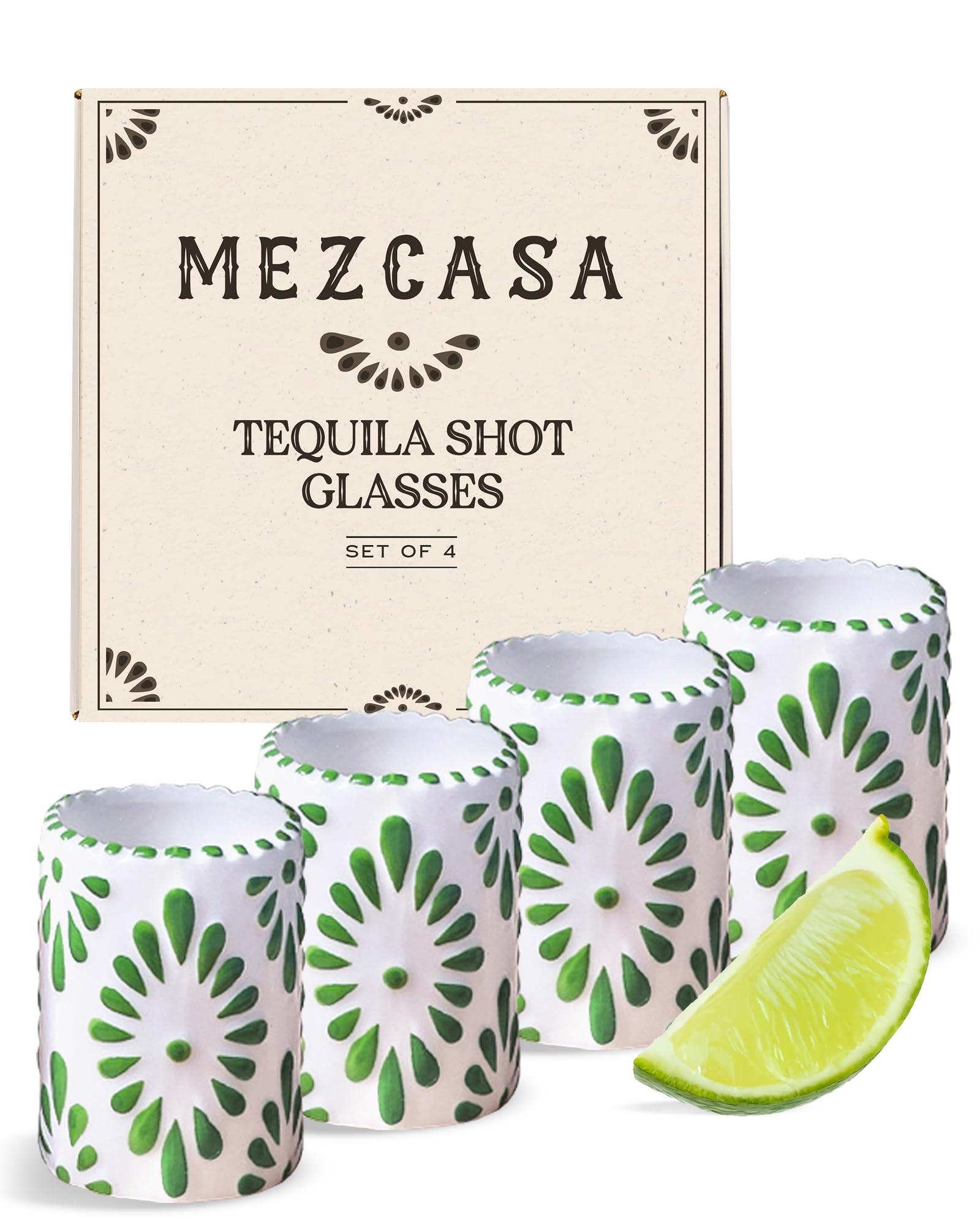MEZCASA Talavera Shot Glasses — 100% Handmade Ceramic Tequila Shot Glasses with Talavera Mexican Pottery Design — Perfect Tequila Gifts for Women & Men for Any Occasion (GREEN | SET OF 4)