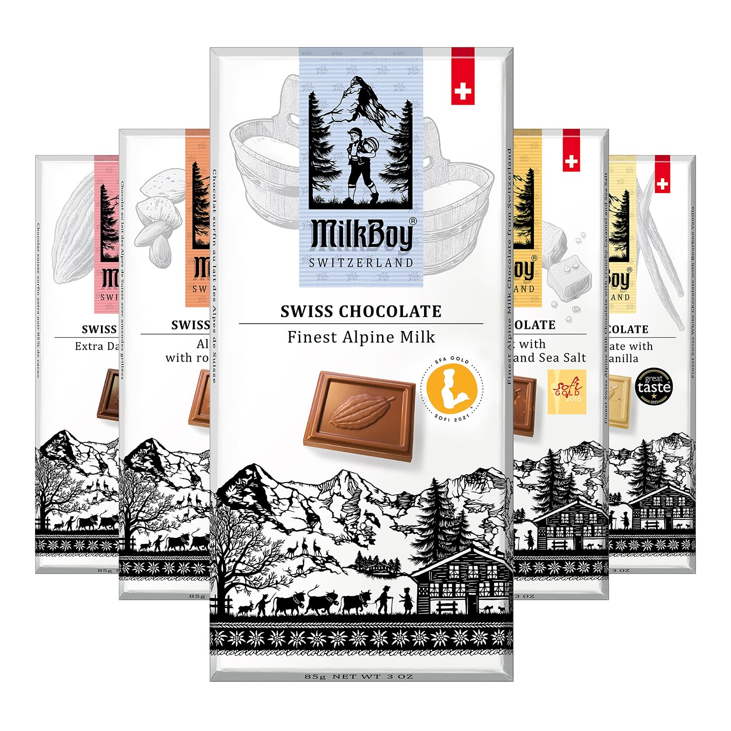 - VARIETY OF FLAVORS - Each pack comes with 5 of our 3-ounce gourmet chocolate bars in Alpine Milk Chocolate, Alpine Milk Chocolate with Crunchy Caramel & Sea Salt, Extra Dark 85% Cocoa, White Chocolate with Bourbon Vanilla, and Alpine Milk Chocolate with Roasted Almonds. Everyone is sure to find a favorite with this flavorful mix of Swiss chocolate bars.