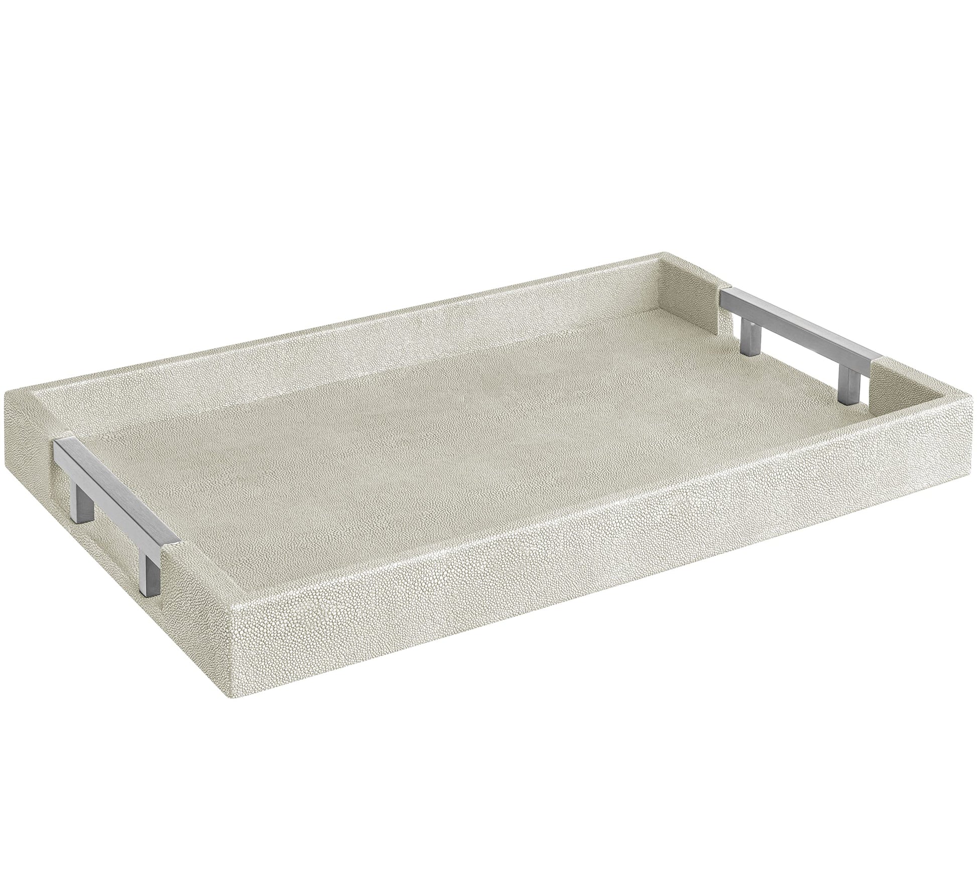 Modern Elegant 18"x12" Rectangle Natural Ivory Beige Faux Leather Shagreen Decorative Tray Ottoman Coffee Table Perfume Vanity Kitchen Serving Tray with Silver Metal Handles by Home Redefined.