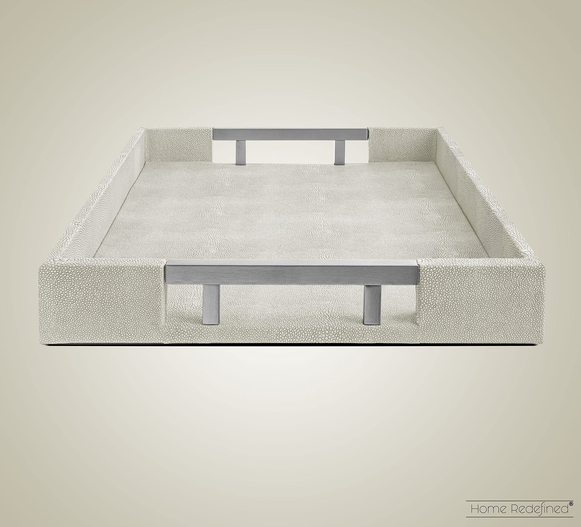 - DECORATE & ORGANIZE YOUR HOME: Eye catching modern faux leather shagreen natural beige decorative serving tray with stainless steel metal handles, the perfect addition to your home or office space.