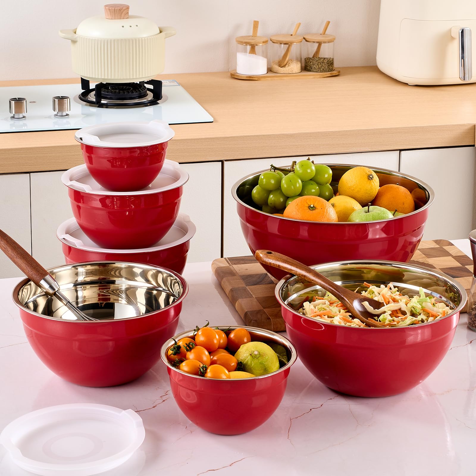 Moxinox Red Mixing Bowls with Airtight Lids, Stainless Steel Nesting Mixing Bowls Set of 7, Ideal for Baking, Prepping and Serving Food, Size 7, 3.6, 2.7, 2.1, 1.5, 1.1,0.8 QT, Stackable Design