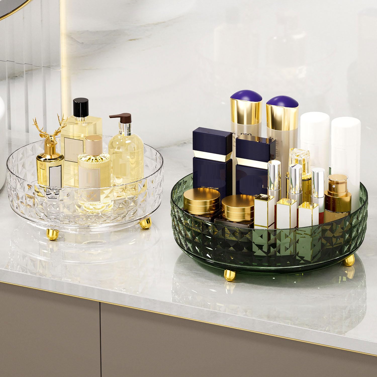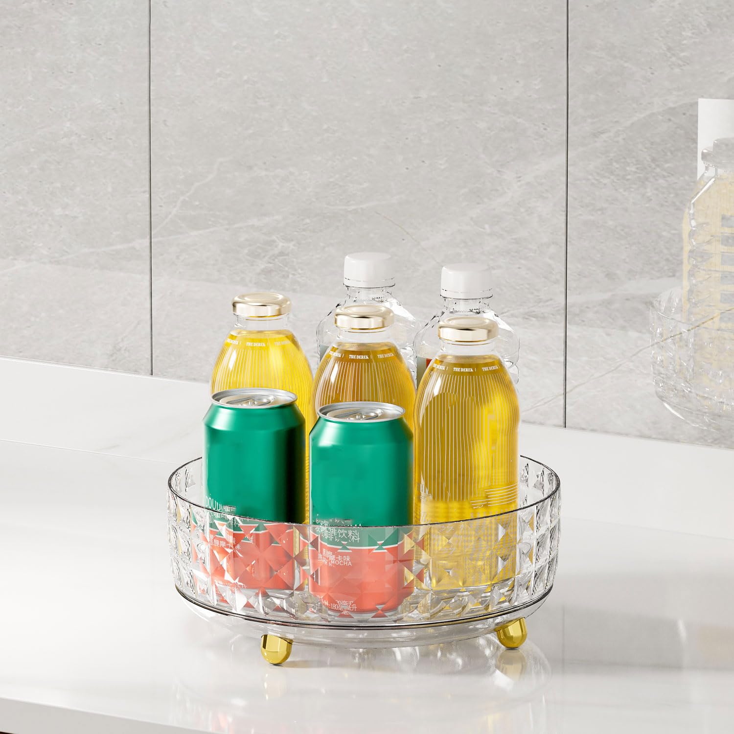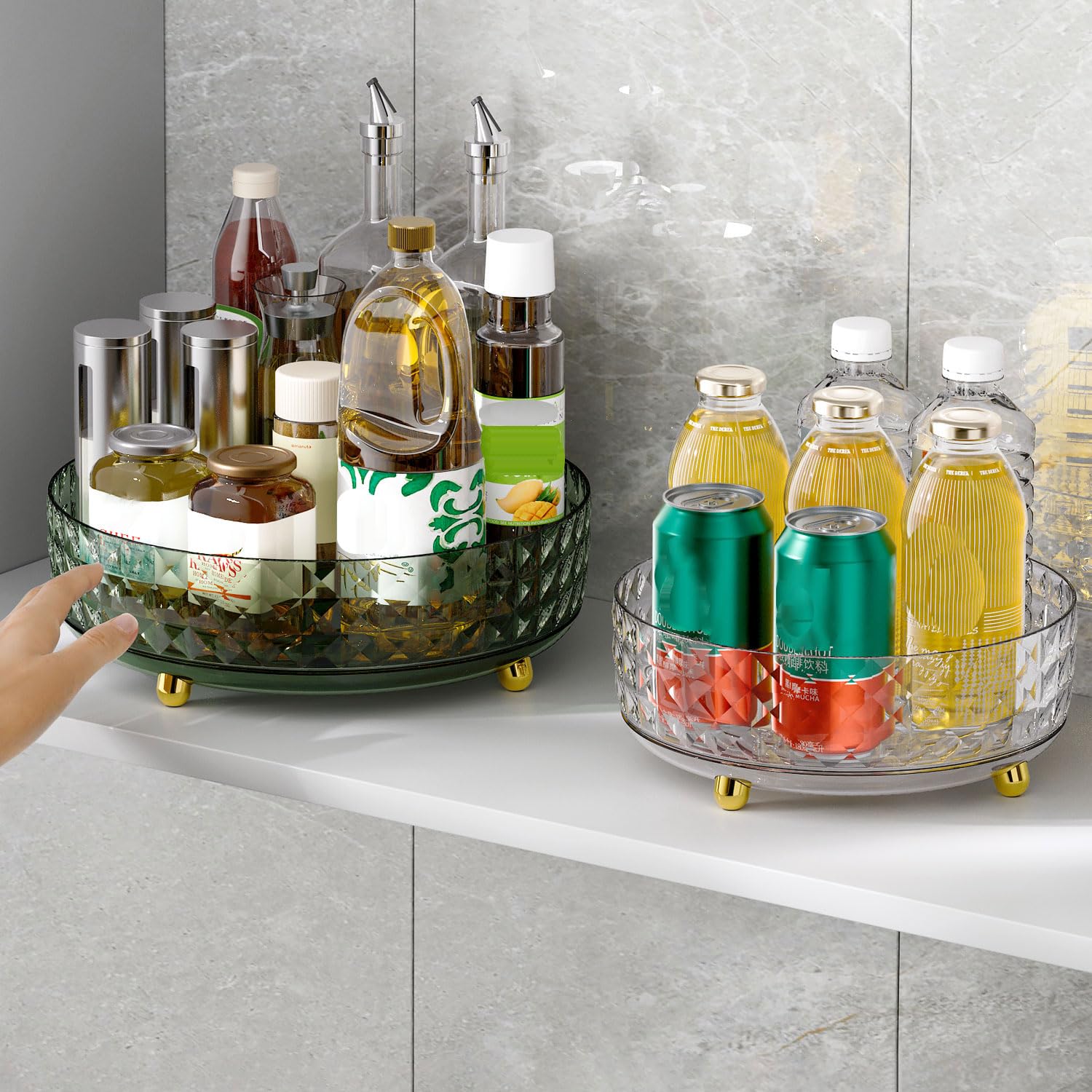 - [ Turn Clutter into Order ] For kitchen countertop, you can organize condiments such as oil bottles, spice jars, etc. For pantry, you can organize drinks, snacks, etc. For bathroom or vanity, you can organize toiletries and cosmetics. For refrigerator, you can organize food such as fruits, vegetables, etc. Make sure the size of the turntable organizer base and edge before purchasing.