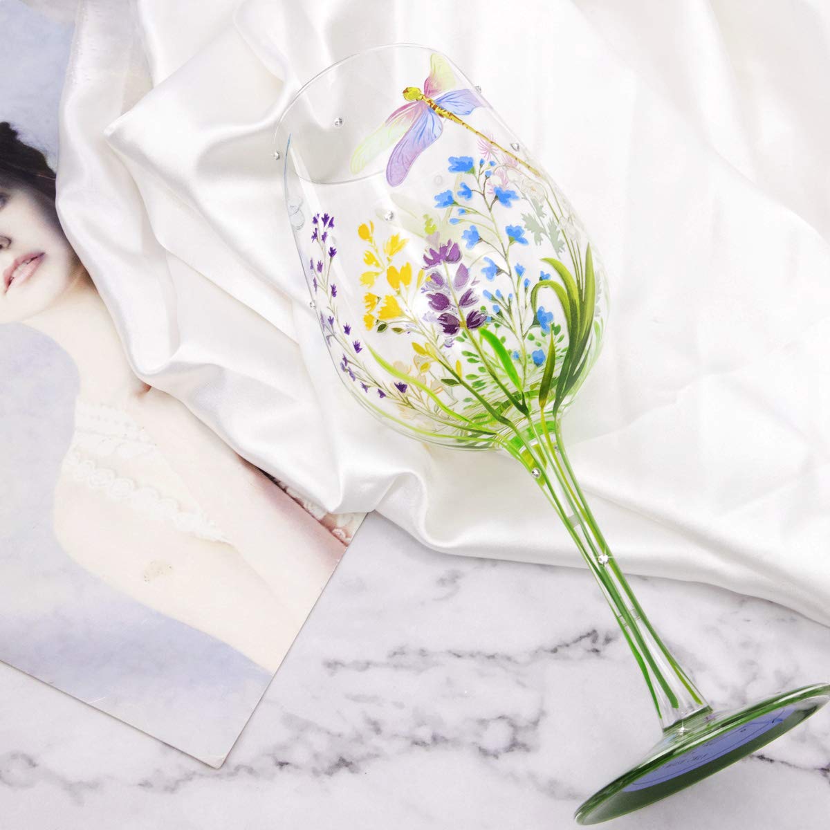 NymphFable Hand Painted Wine Glass Colorful Dragonfly Flower Artisan Painted 15 oz Glass Novelty Gift for Birthdays,Weddings,Valentine's Day