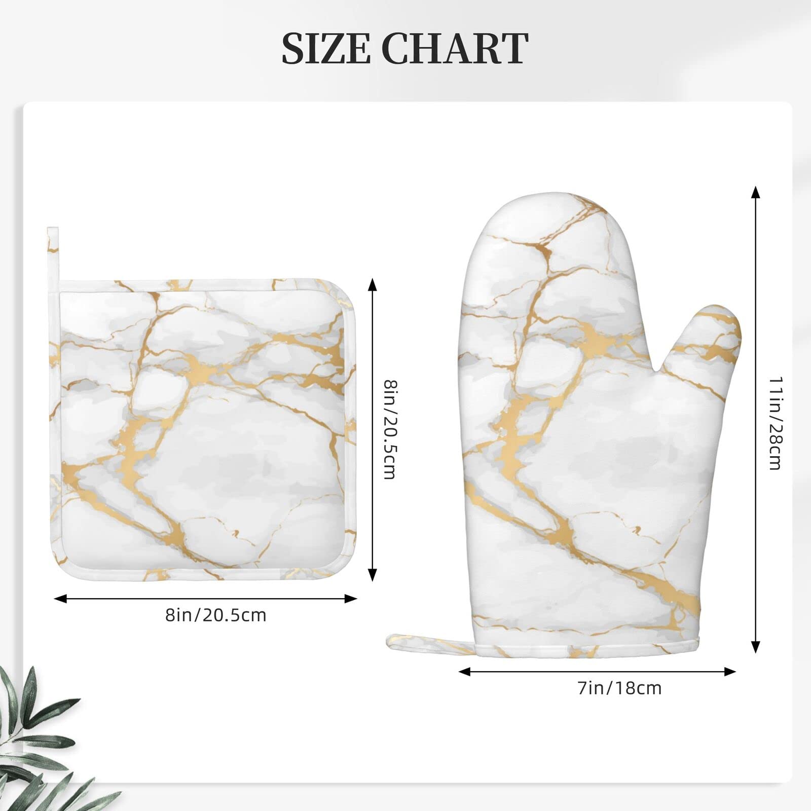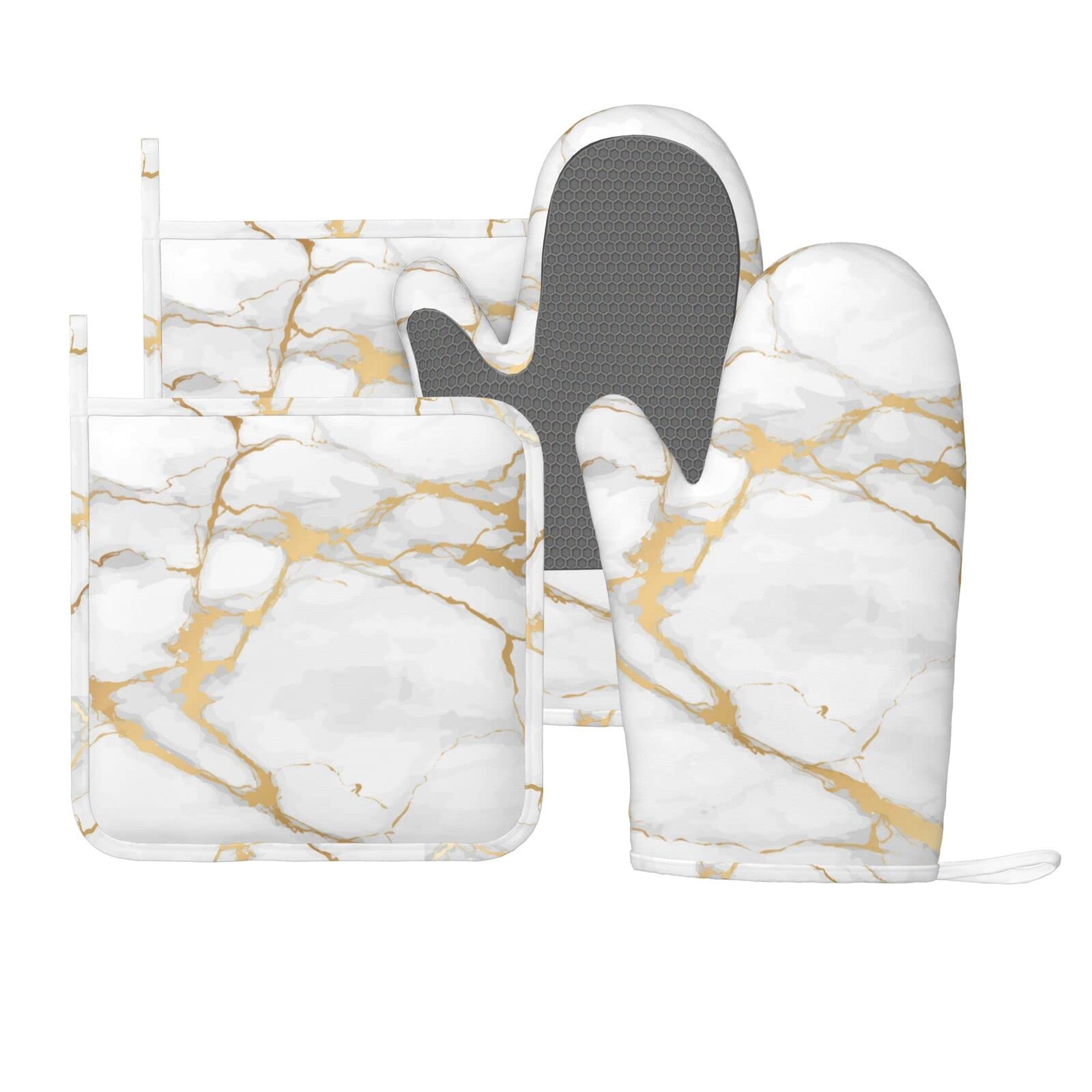 Oven Mitts and Pot Holders Marble White Gold Silicone Kitchen Accessories Set of 4 Heat Resistant Long Gloves Potholder Non-Slip Grip for Chef Cooking, Baking, Grilling, BBQ