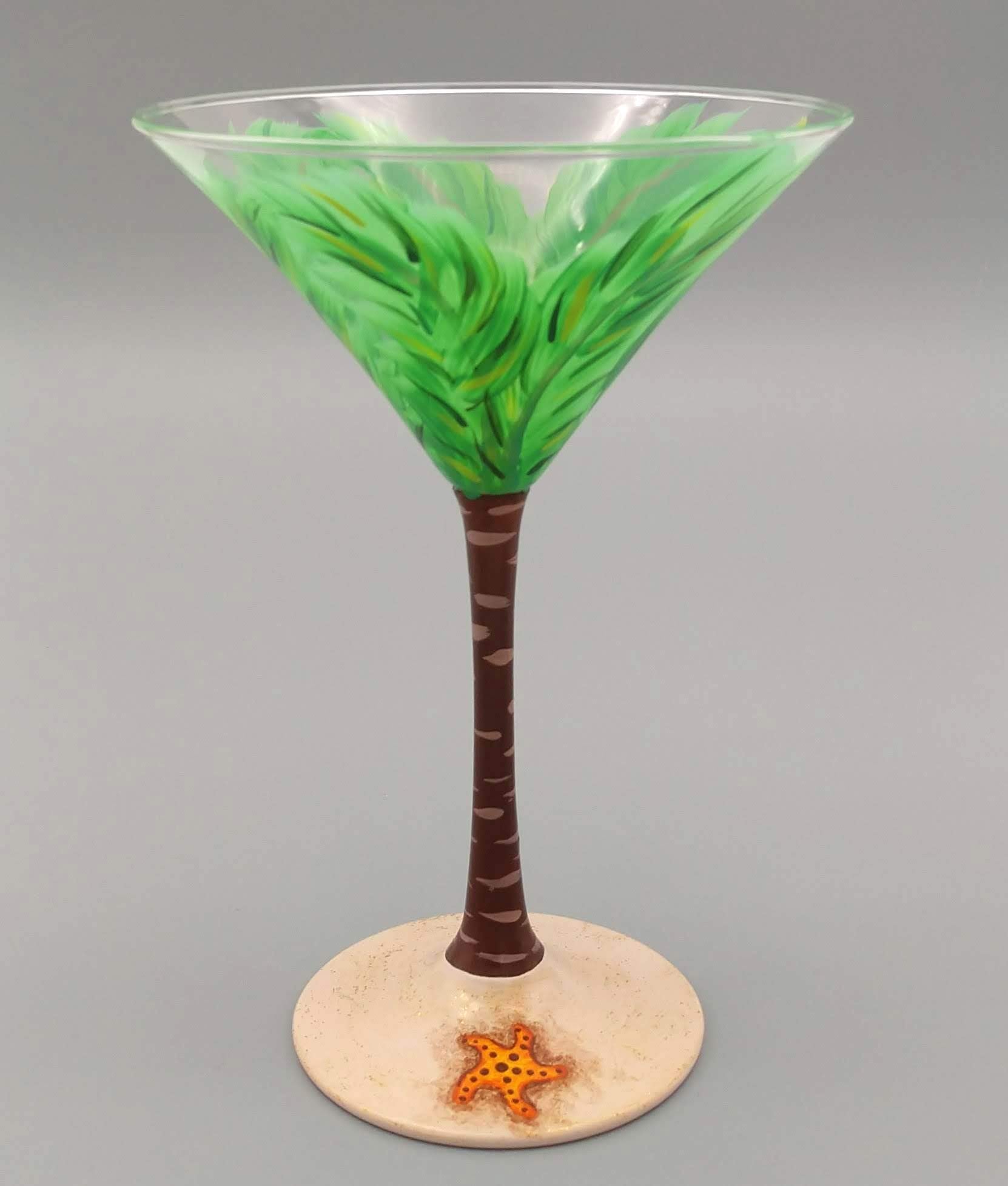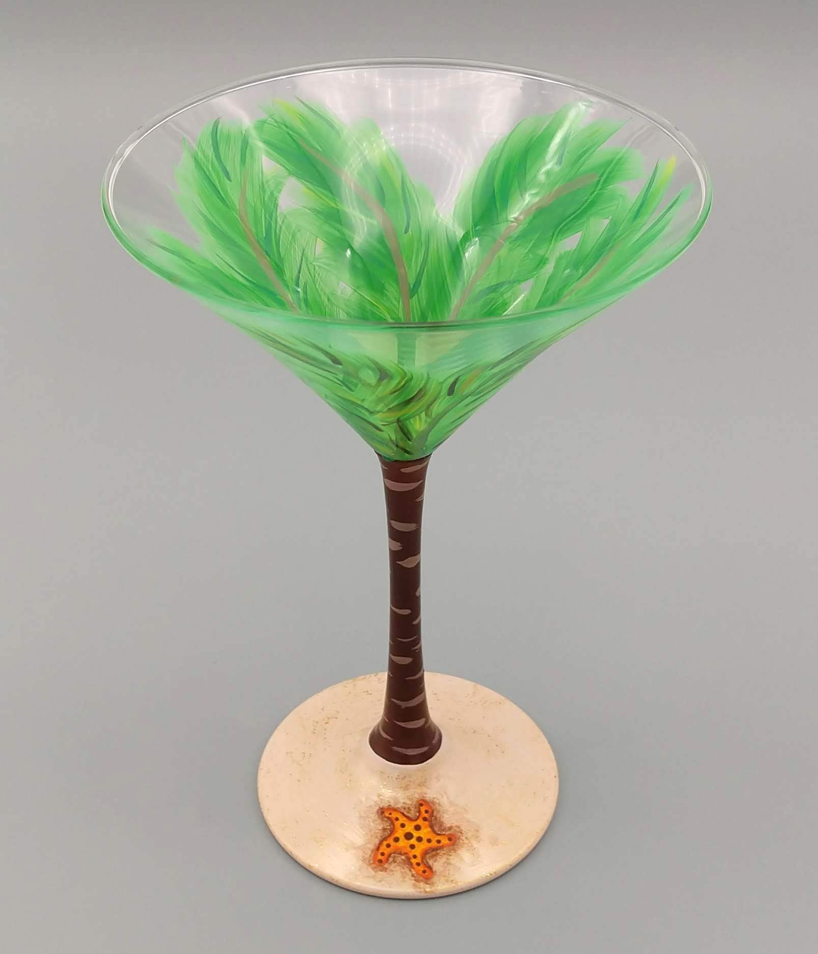 Palm Tree Martini Glass - Starfish, Shell, Sea Turtle, Sparkly Sand - Tropical Theme - Hand Painted
