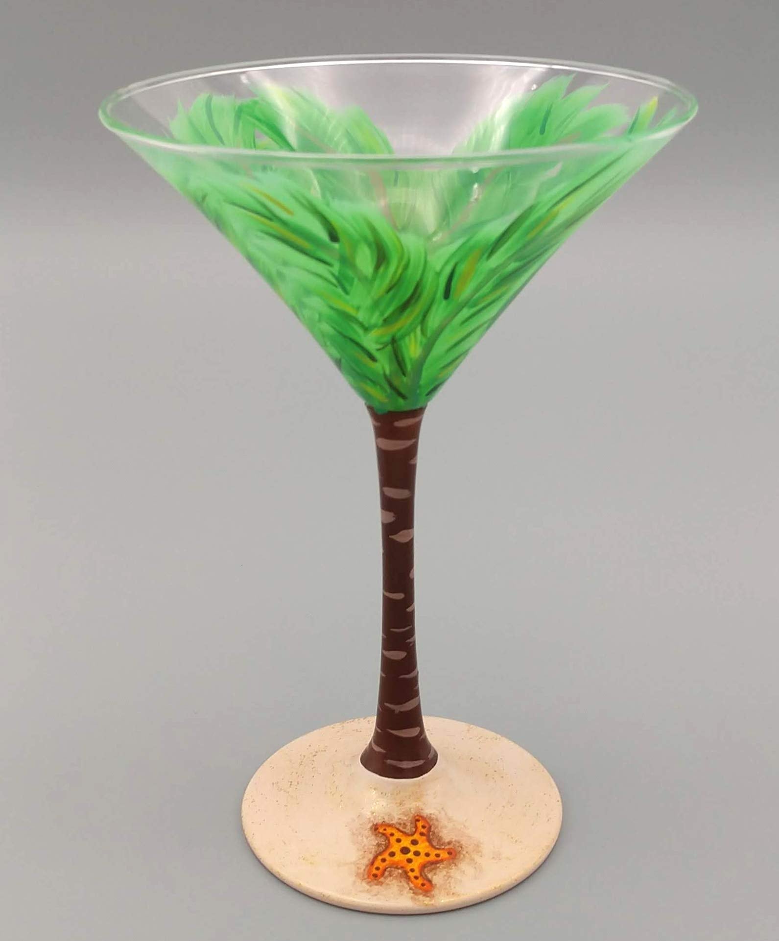 Details: This tropical themed martini glass features a base of sparkly sand with a brown tree trunk, green palm branches and your choice of starfish, shell, conch, sea turtle, mermaid tail or sea horse resting on the bottom. The glass can also be personalized on the base in green.