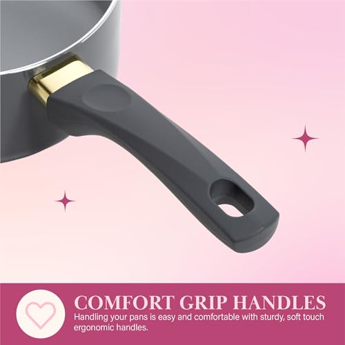 - COOK IN STYLE: The soft touch, stay cool handles provide comfort and control while your culinary creation sizzles. The multi-layer non stick coating allows for easy food release and clean up. Save your manicure, no scrubbing needed as this is a dishwasher safe pots and pans set, clean up is simple.