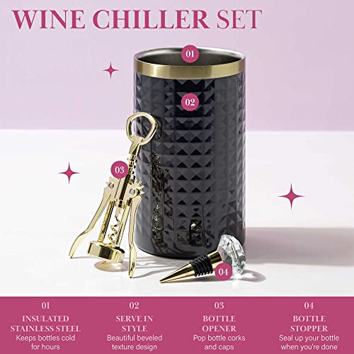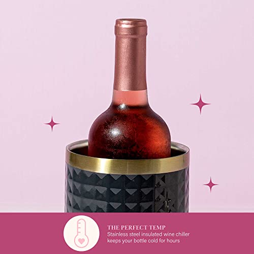Details: Serve with style with Paris Hilton's wine chiller set. Comes with everything you need to sliv your best life: a stainless steel insulated wine chiller, gold tone winged corkscrew with bottle opener, and diamond shaped wine stopper. The beautifully textured, double wall chiller will keep wine, champagne and other 750mL bottles at the perfect temperature for hours, no ice needed. This wine cooler will keep your red wine or white wine at the proper serving temperature. The golden winged corkscrew will help pop the cork for your wine and also opens bottles, as it features a bottle opener that works great for bottle caps. An excellent addition to any bar cart or counter top and can be used inside or outside, making you the host with most. When the champagne campaign is over, keep your bottle fresh with the diamond shaped wine stopper. The food grade silicone ring on the bottle stopper works for sealing bottles of wine, oil, soda and more. You can add a little more sparkle to your dinner, parties or bottomless mimosa brunch with your besties, as this pairs perfectly with the Goddess of Glam's new line of Rhinestone wine tumblers. A must-have for the wine enthusiast in your life. Sets are available in gold, charcoal and pink to match any home decor or kitchen decor. Makes an excellent gift for a birthday, wedding, housewarming party, and holiday or Christmas gifts. Check out all Paris Hilton offers to make your home and kitchen more glamorous, so you too can be a #bossbabe.