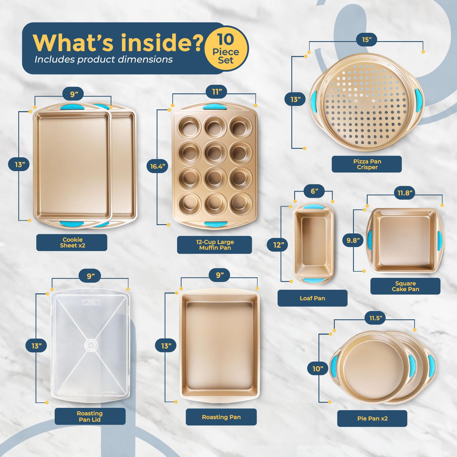 Perlli Baking Pan 10-Piece Set Nonstick Gold Steel Oven Bakeware Kitchen Set with Silicone Handles, Cookie Sheets, Round Cake Pans, 9x13 Pan with Lid, Loaf Pan, Deep Pan, Pizza Crisper, Muffin Pan