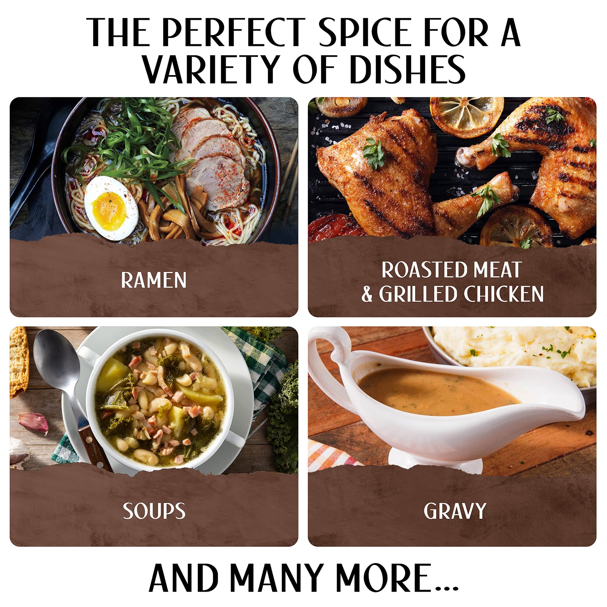 - Unlike big competing brands, our premium spices are created in small batches to ensure quality control and freshness. Unlike others, our flavor profile is neutral and not specific to oriental or ramen. It can also be used for steak, chicken, and many other meals to add the Umami flavor. It replaces the need for bouillon cubes, powders, paste, or MSG.