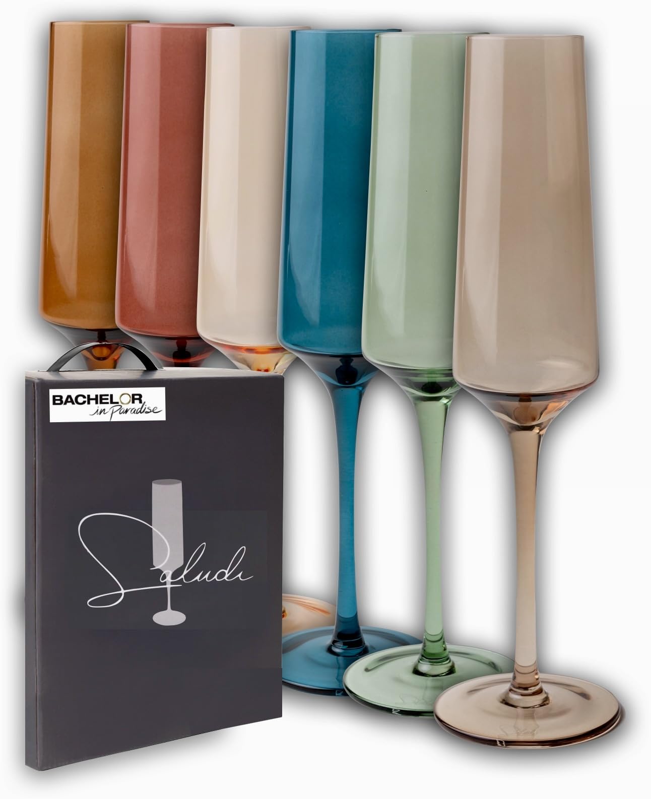Saludi Colored Champagne Flutes - As Seen on 'Bachelor in Paradise' - 7oz (Set of 6) Stemmed Multi-Color Champagne Glass - Great for All Occasions and Gifts - Luxury, Durable, Hand-Blown