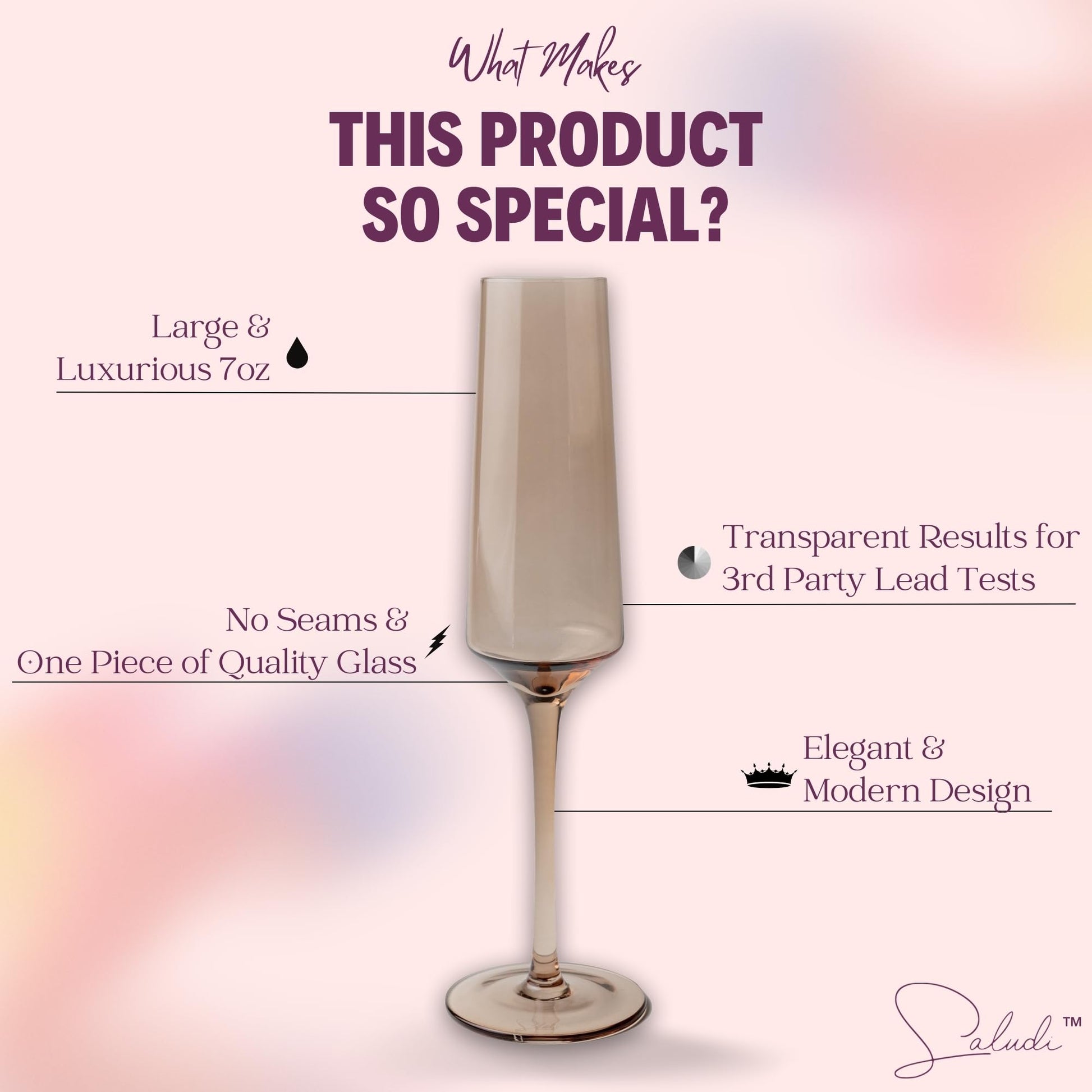 - THE BEST GIFT - Our luxurious glassware is carefully packaged in a stylish gift box for safe shipping and is the perfect gift for any occasion, from housewarmings to weddings and beyond. Invest in a set of Saludi champagne flutes and enjoy for years to come!