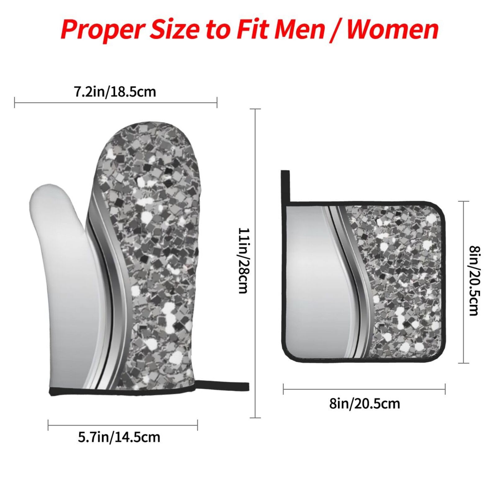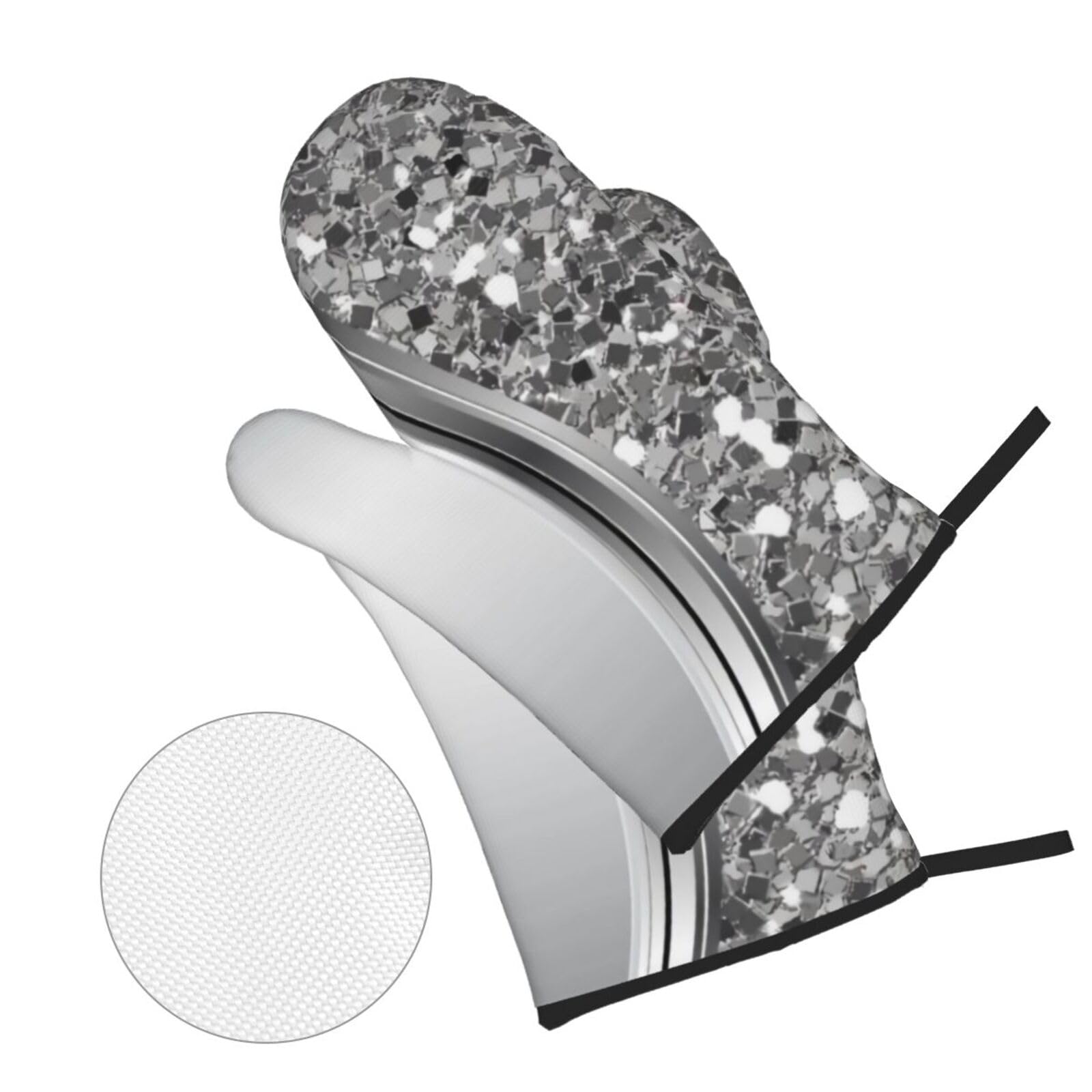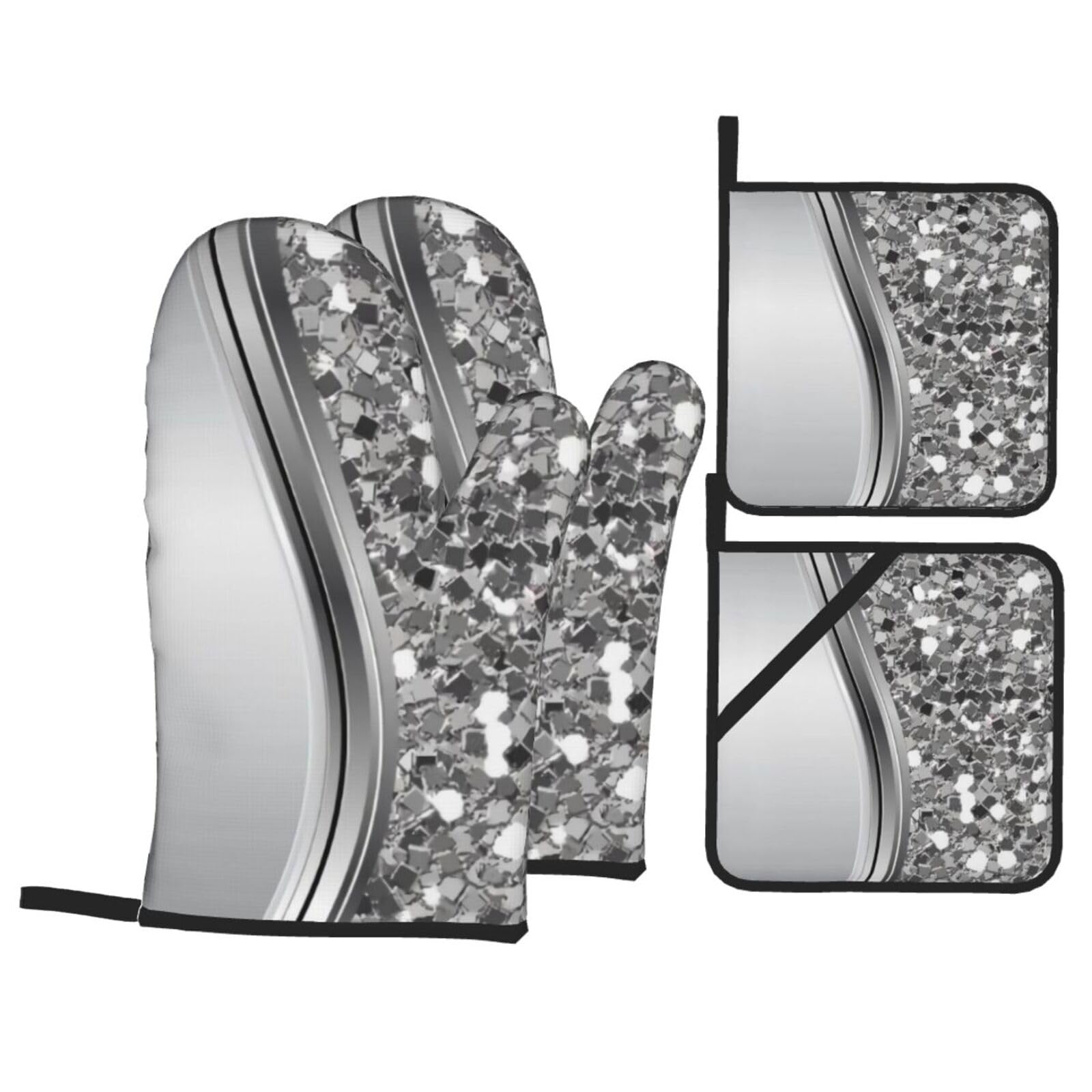 Silver Sparkle Glam Bling Oven Mitts and Pot Holders 4 Pcs Set,High Heat Resistant 500 Degree Extra Thicken Long Kitchen Cotton Oven Glove for Cooking