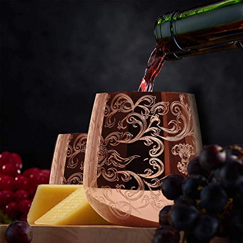 - The elegance of the wine glasses and its premium quality stainless steel just shines out with perfect grace and will add royalty to your kitchen. It has the classic delicate engravings from ancient times. Only a wine glasses like this can match the nobility and stature. The copper colored wine cups talk of complete royalty and noble class.