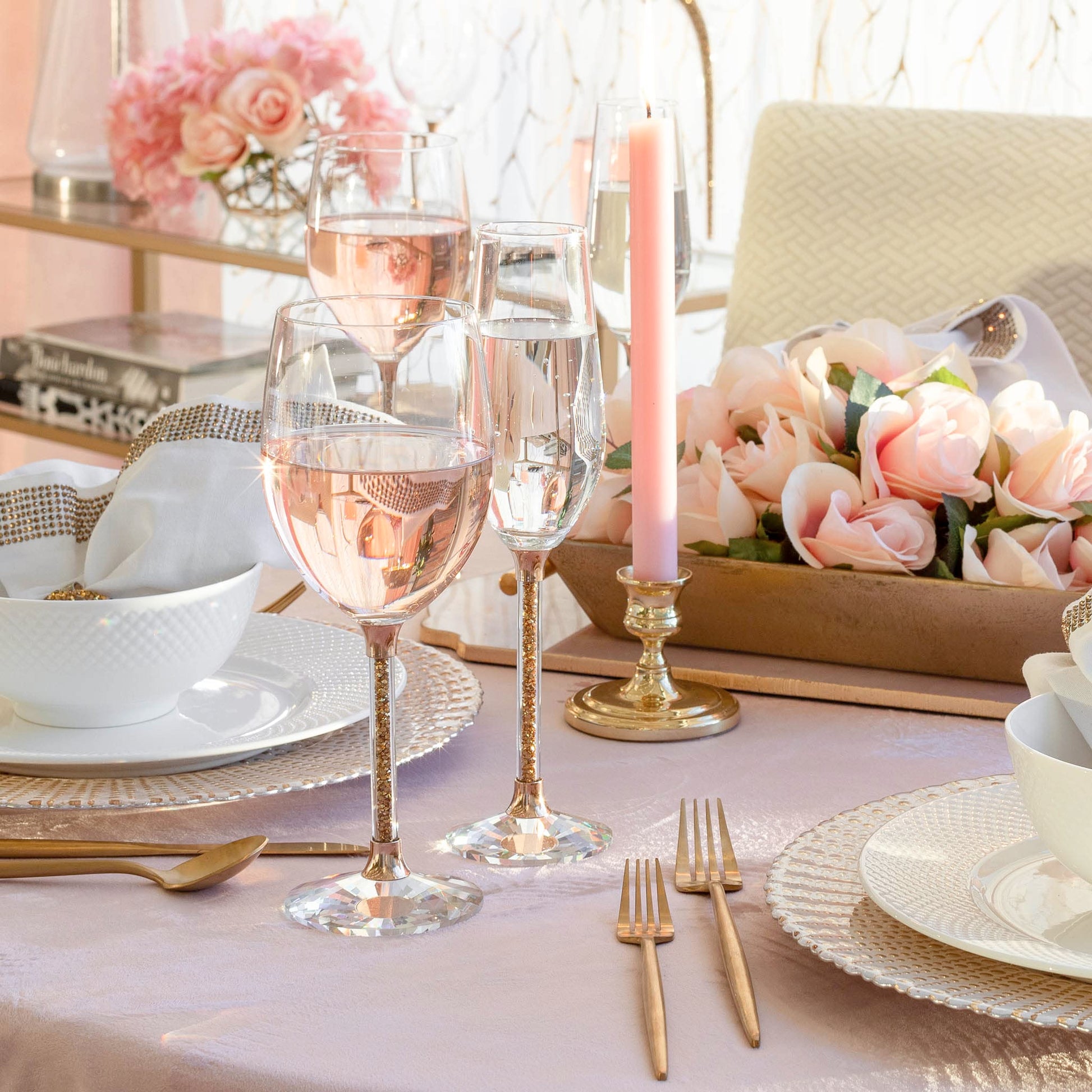 - DESIGN: Each wine glass is crafted from high-quality crystal with a faceted base that beautifully catches the light. The stem is filled with sparkling glass rhinestones, available in silver, gold, charcoal, or rose gold, adding a touch of luxury to your wine experience.