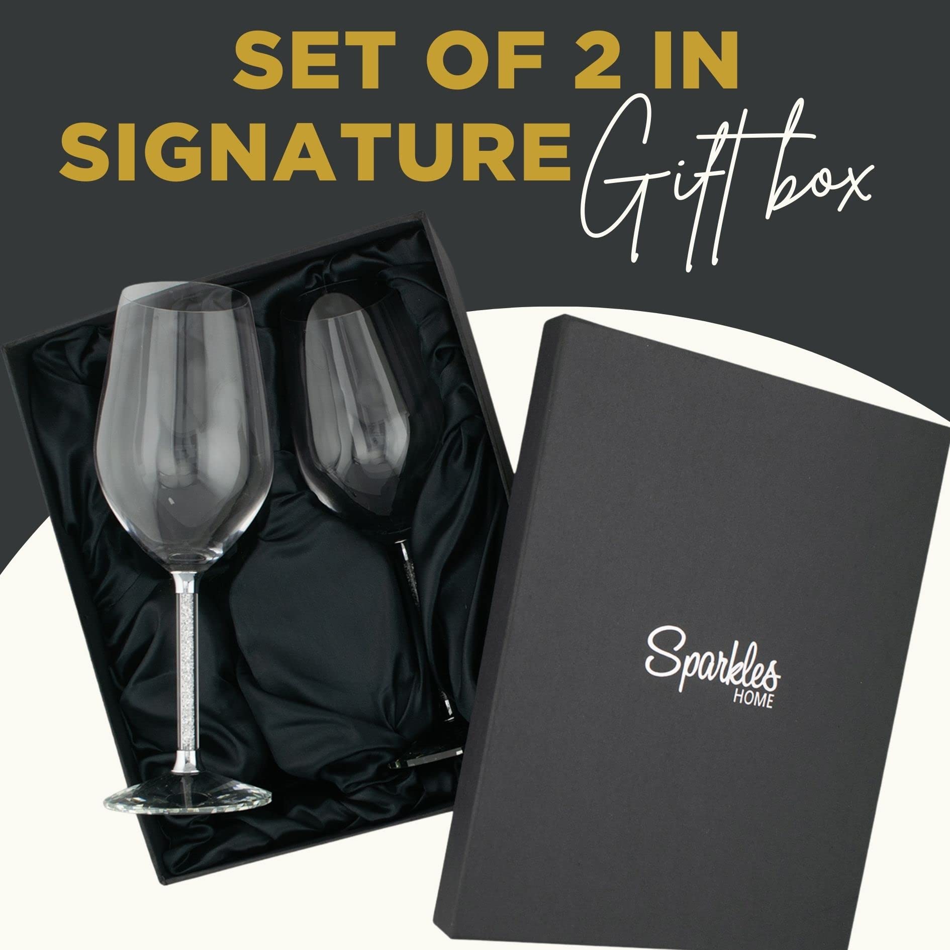 - GIFTING OPTION: These wine glasses are an ideal gift for wine enthusiasts, newlyweds, or anyone looking to add a bit of sparkle to their glassware collection. The option of a satin-lined keepsake box for the set of 2 offers an extra touch of elegance, making it a memorable gift.
