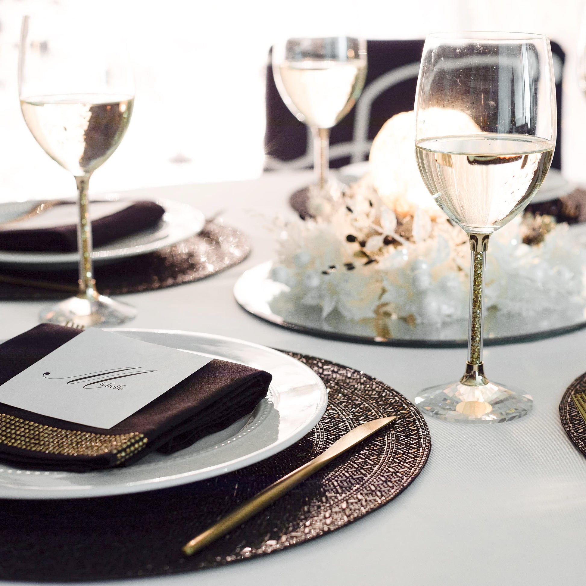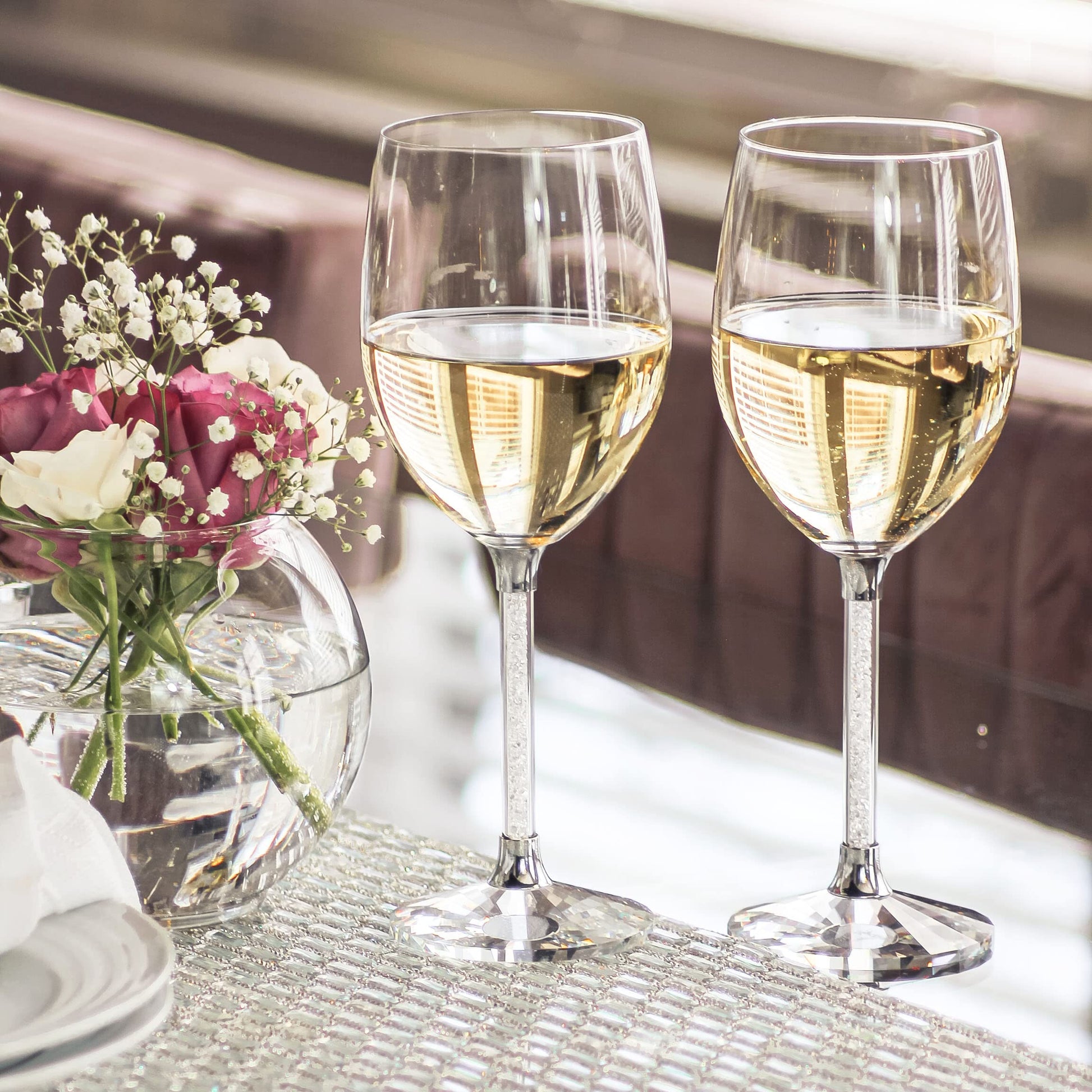 - DESIGN: Each wine glass is crafted from high-quality crystal with a faceted base that beautifully catches the light. The stem is filled with sparkling glass rhinestones, available in silver, gold, charcoal, or rose gold, adding a touch of luxury to your wine experience.