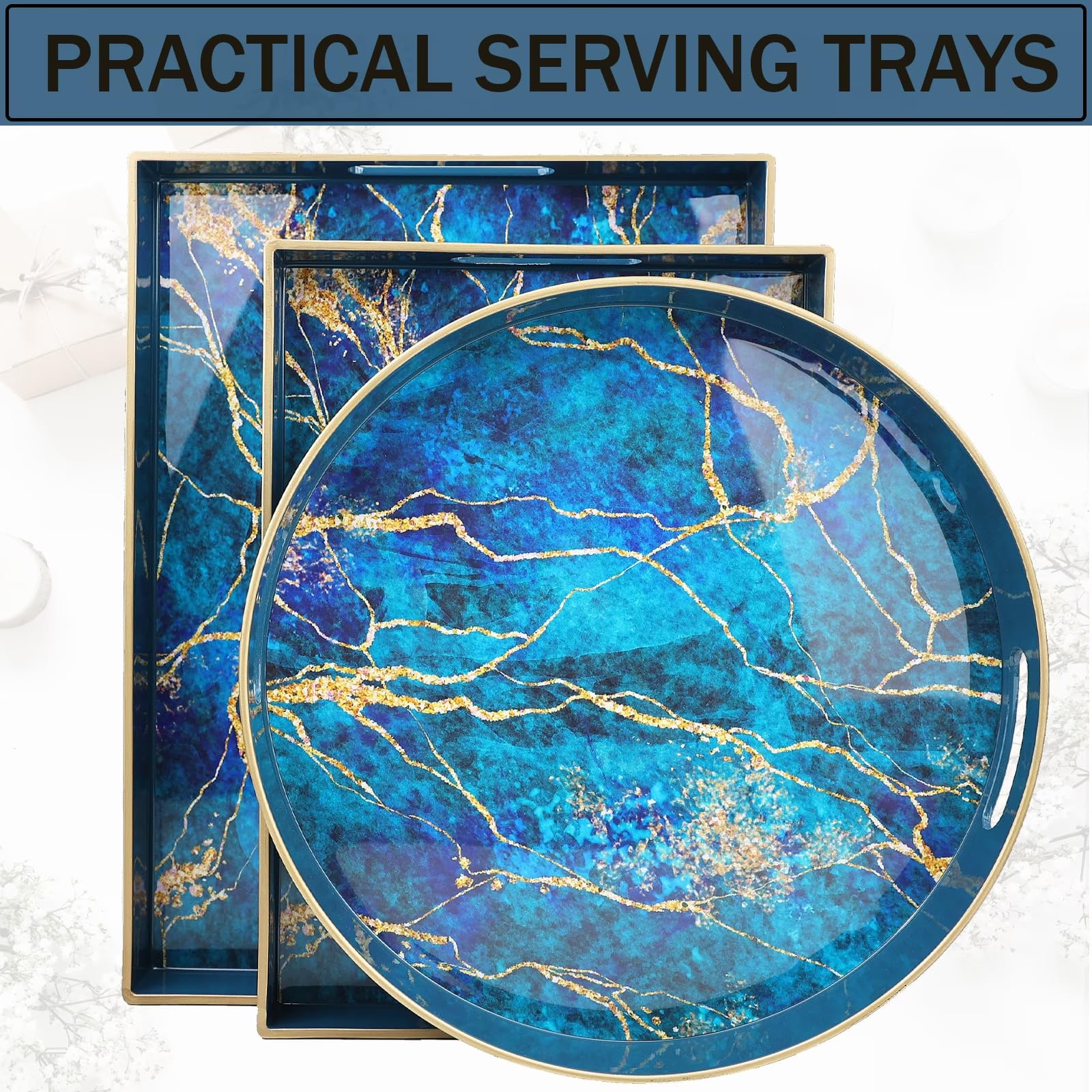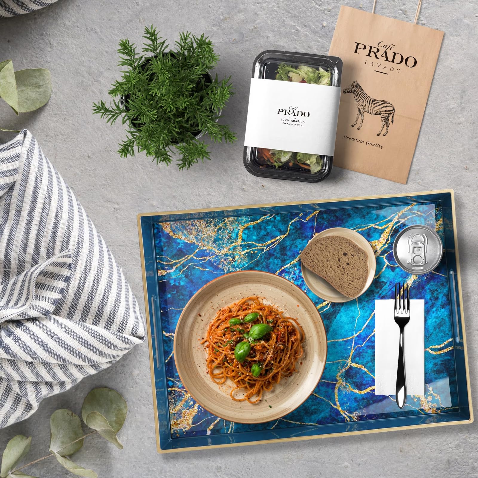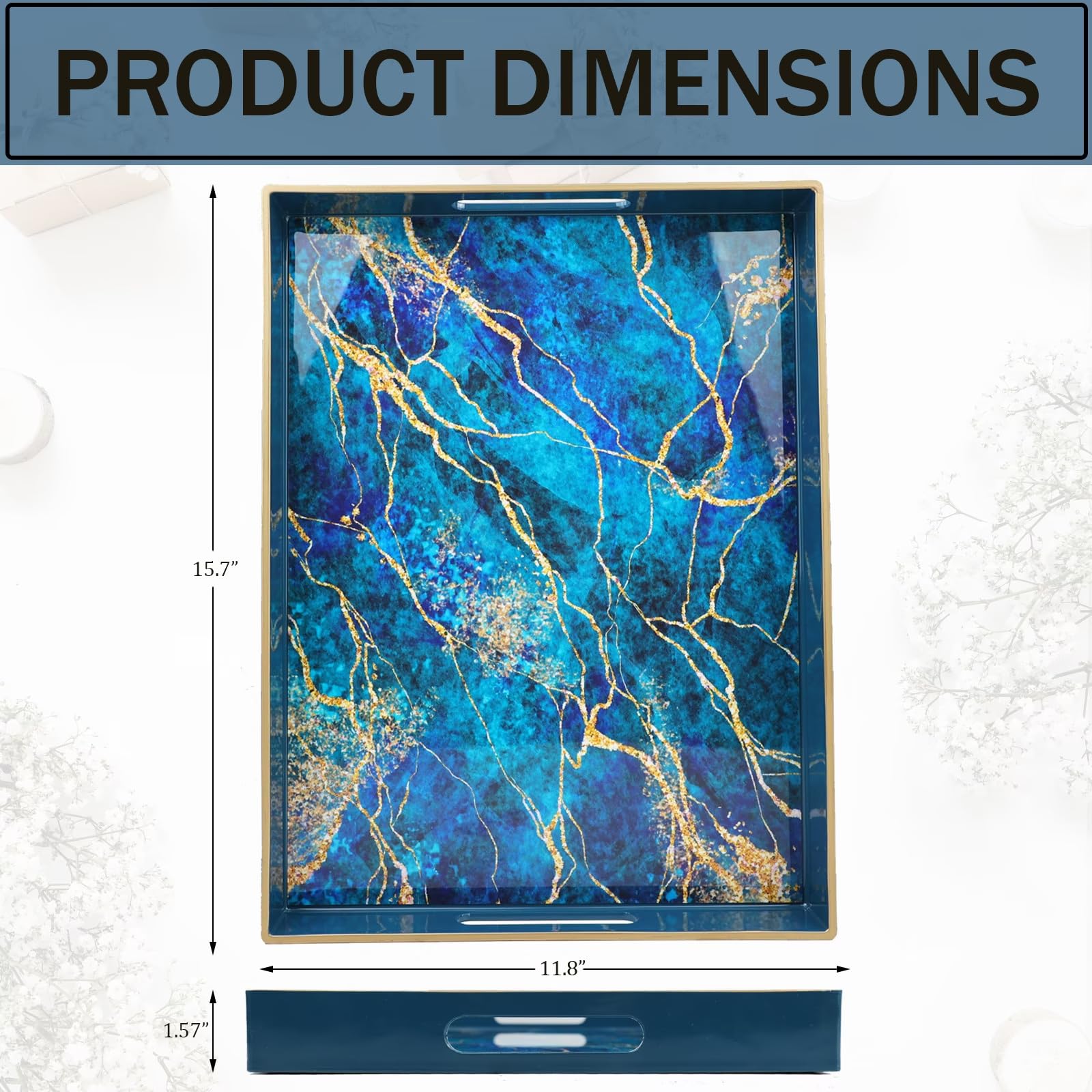 Vibrant Blue and Gold Marble Decorative Plastic Serving Trays with Handles for Living Room, Coffee Table, Ottoman, Bathroom, Kitchen, Large 15.7”*11.8”*1.6"