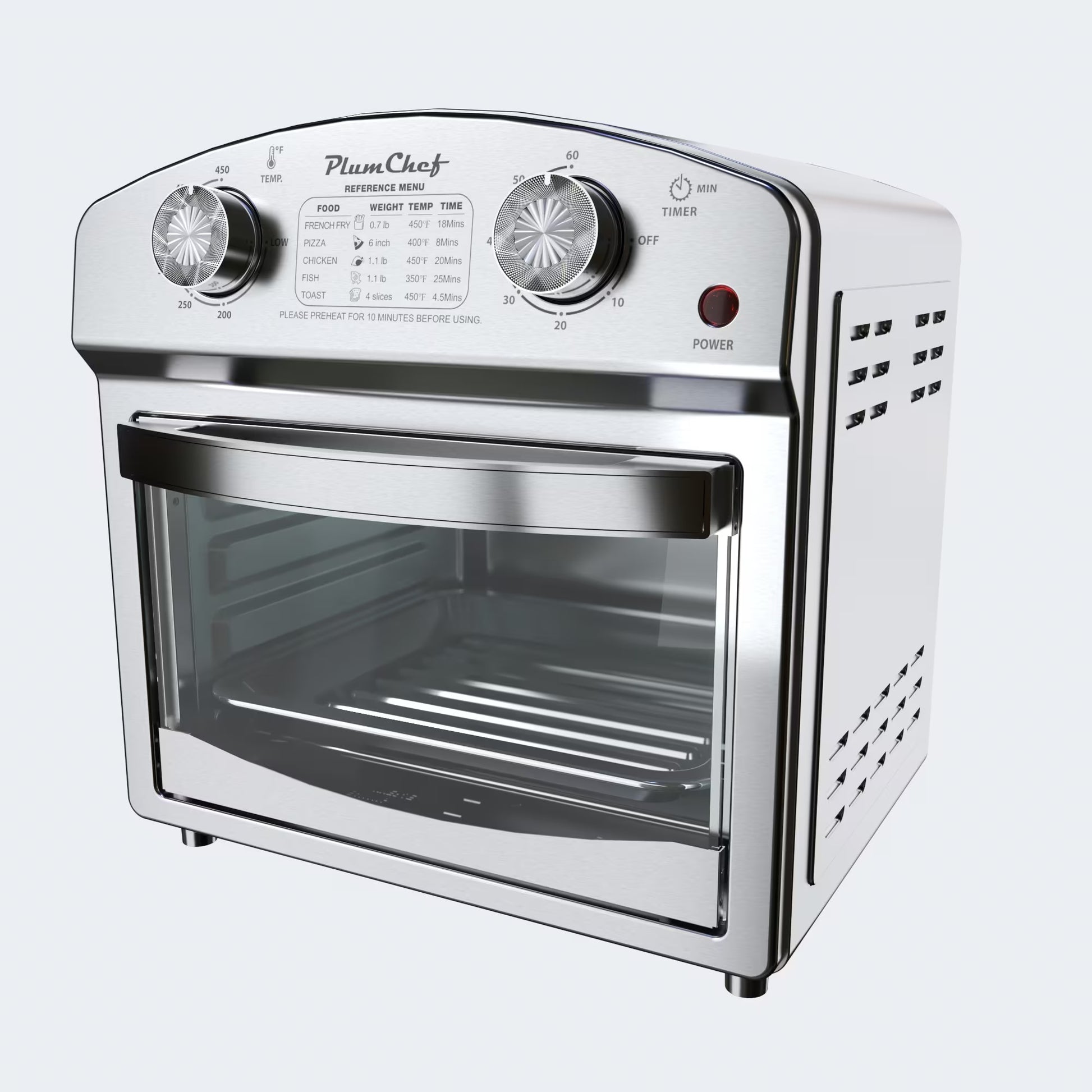 3. Dual Knobs for Simple Operation The two easy-to-use knobs let you control the temperature (up to 450°F) and set the timer for up to 60 minutes, ensuring precise cooking every time. The preset modes for French fries, pizza, chicken, fish, and toast offer additional convenience.