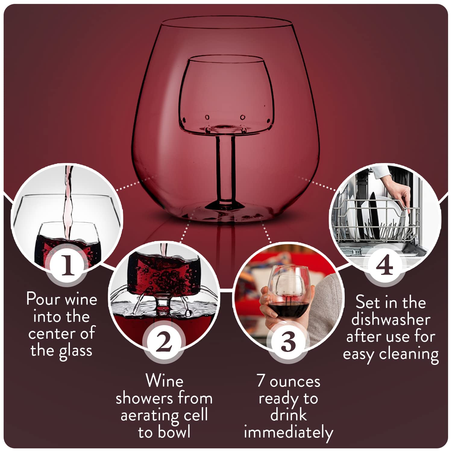 - Patented Design: Our patented aerating wine glasses are handmade of durable, high-quality tempered glass and features a wine aerator built into the glass. The glasses instantly aerate 7 oz of wine on each pour.