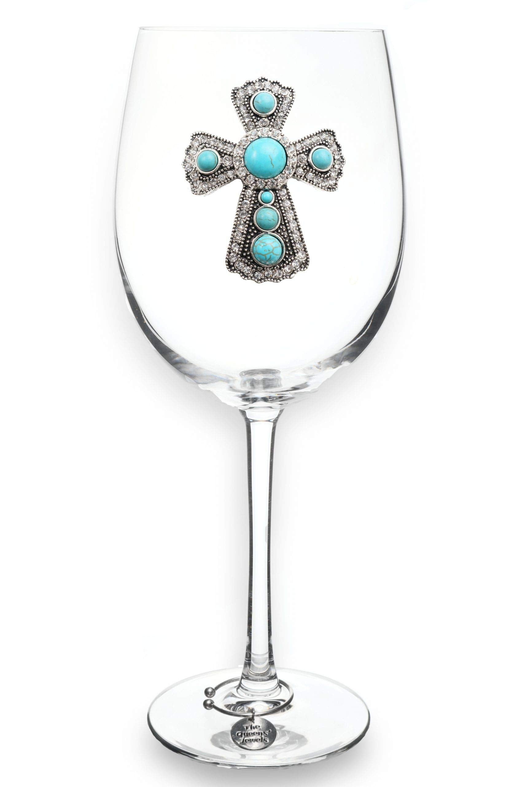 Turquoise Cross Jeweled Stemmed Wine Glass, 21 oz. - Unique Gift for Women, Birthday, Cute, Fun, Not Painted, Decorated, Bling, Bedazzled, Rhinestone