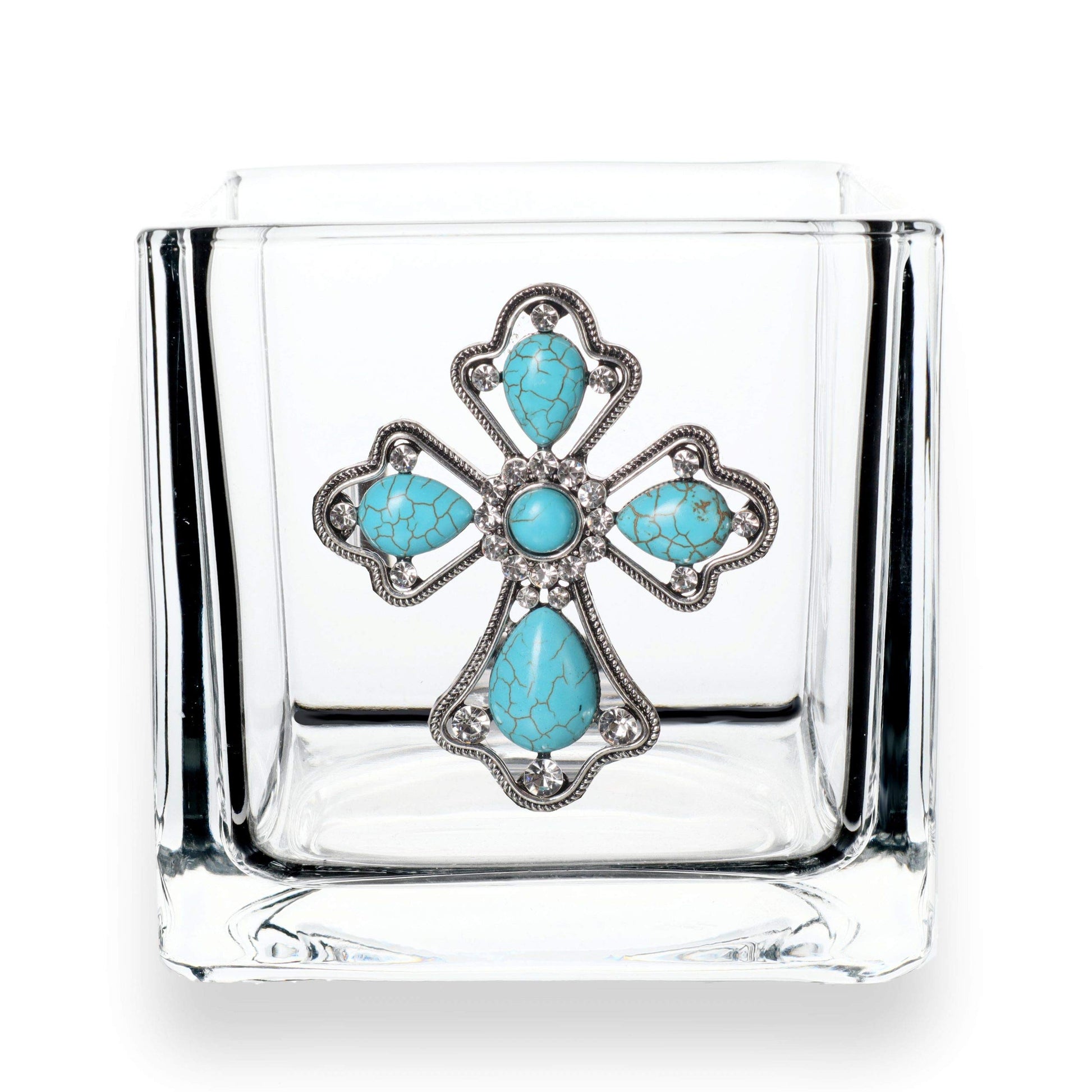 THE QUEENS' JEWELS Turquoise Teardrop Cross Jeweled 4x4 Candleholder Vase - Unique Gift for Women, Birthday, Cute, Fun, Not Painted, Decorated, Bling, Bedazzled, Rhinestone