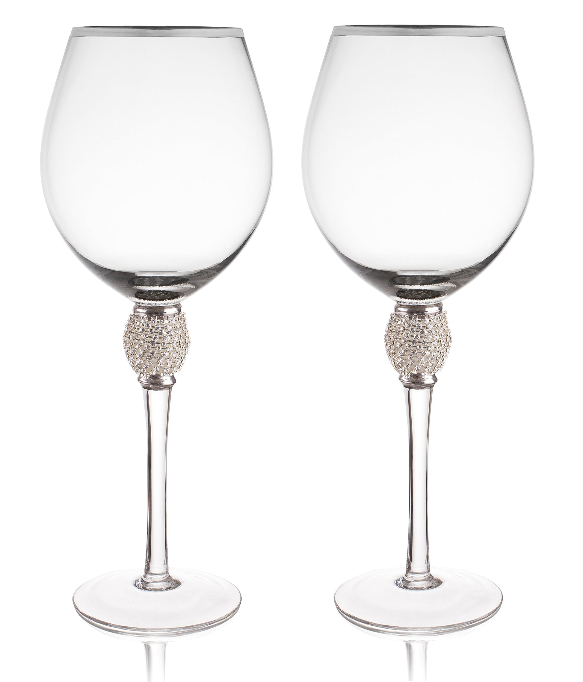 Trinkware Set of 2 Wine Glasses - Rhinestone DIAMOND Studded With Silver Rim - Long Stem, 16oz, 10-inches Tall – Elegant Glassware And Stemware