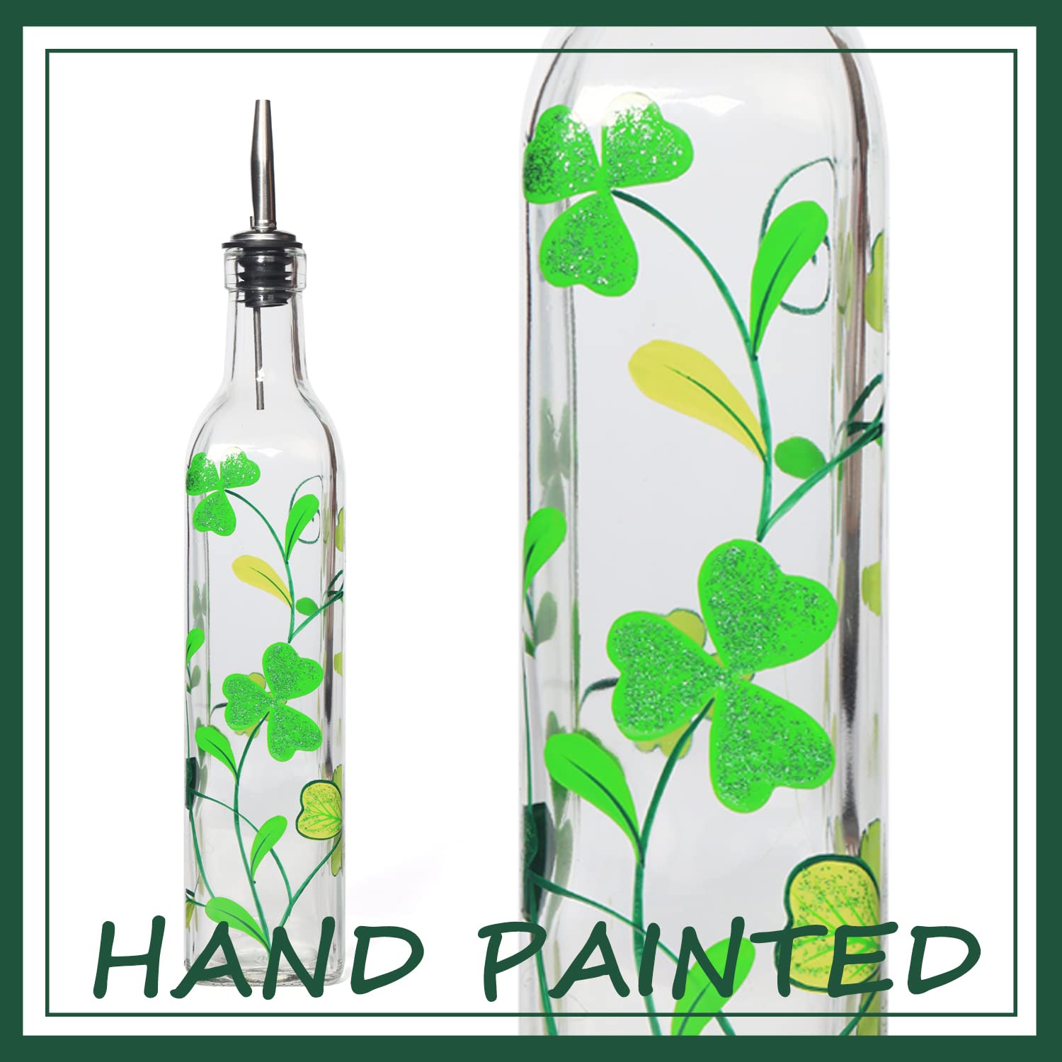 YIYUKODO 17oz Hand Painted Glass Olive Oil Bottle - 500ml Green Oil & Vinegar Cruet with Pourers - Olive Oil Carafe Decanter for Kitchen (Shamrock)